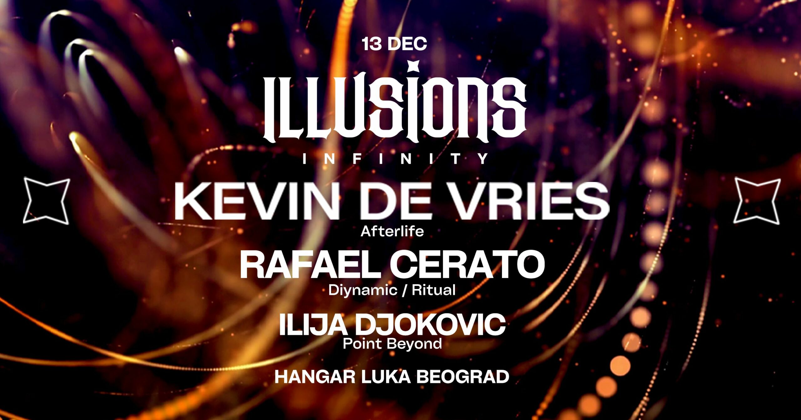 ILLUSIONS otvara zimsku sezonu i sprema još jedno magično veče, audio vizuelnom senzacijom, i udarnim lineup-om, sa poznatim imenima sa svetske Dj scene, koji stižu u Hangar, Luke Beograd u petak 13.Decembra. Zvezda Afterlife-a iz Berlina, KEVIN DE VRIES, zatim, jedan od traženijih DJ-eva sa poznate Dynamic etikete, RAFAEL CERATO koji će po drugi put će nastupati u Srbiji, kao i domaća zvezda ILIJA ĐOKOVIĆ.