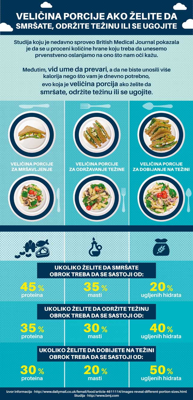 Kontrola porcija podjednako je važna kao i ono što se nalazi na samom tanjiru da biste ostvarili cilj vezan za svoj fizički izgled. A kako obično procenjujete koja vam je veličina porcije dovoljna? Većina ljudi se oslanja na svoj vid, odnosno kako sama porcija izgleda, što ume da bude varka. A da se ne biste prevarili tako lako, pogledajte kako zapravo treba da izgleda porcija ukoliko želite da smršate, dobijete na težini ili samo je održavate.