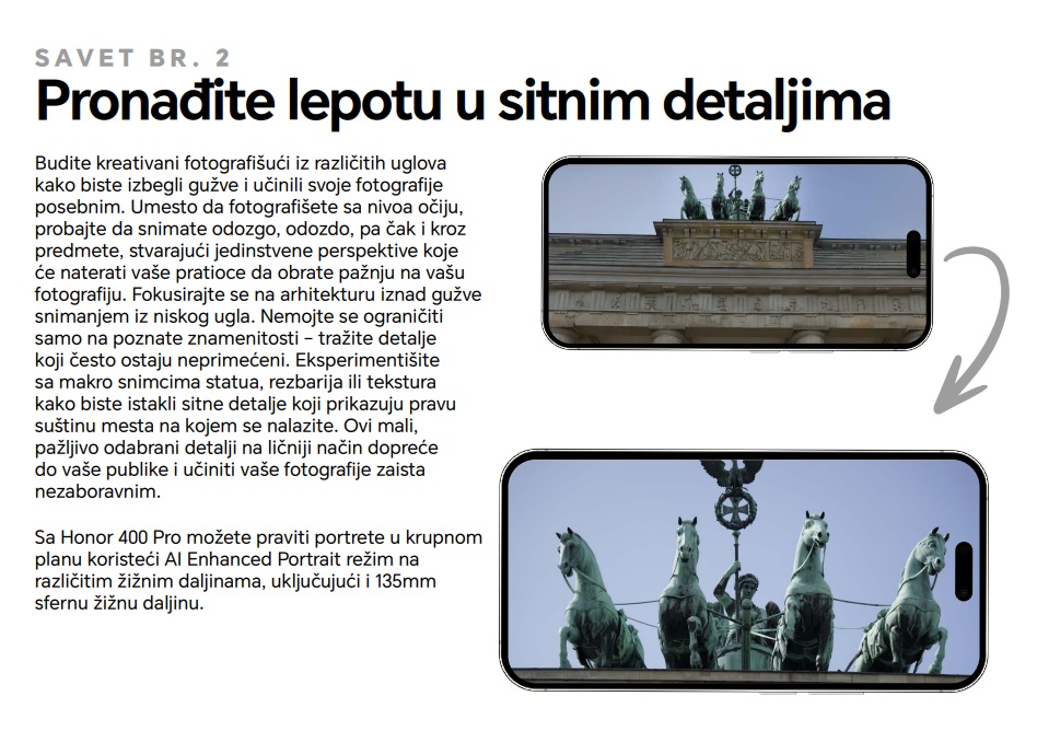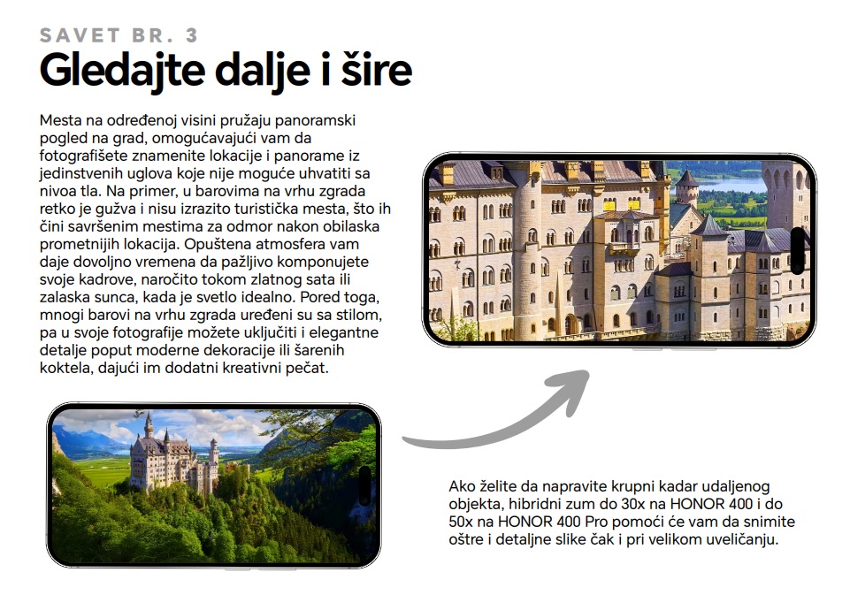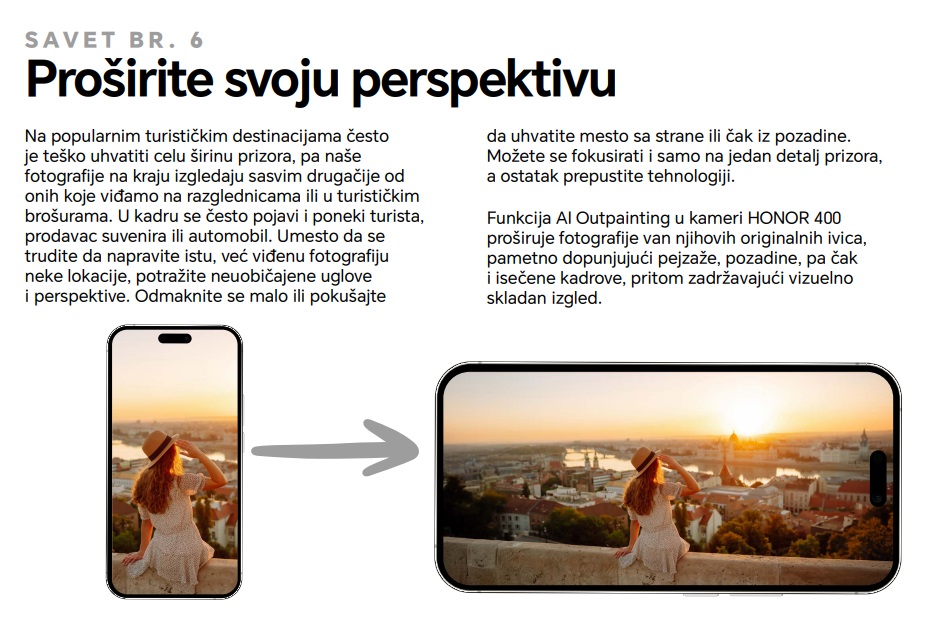 Budimo iskreni – putovanja danas često sa sobom nose pritisak da se uhvati ona savršena fotografija za društvene mreže. Za mnoge Gen Z putnike ovo iskustvo lako može da preraste u stres, gde se više vremena provodi u potrazi za idealim kadrom nego u pravom uživanju u destinaciji. Zato je HONOR kreirao ultimativni Vodič za fotografiju sa putovanja, prepun saveta. Namenjen je svima koji žele da snime zadivljujuće fotografije brzo i s lakoćom, kako bi mogli da se prepuste trenutku, a da pritom iskoriste priliku da uhvate one savršene kadrove za Instagram.