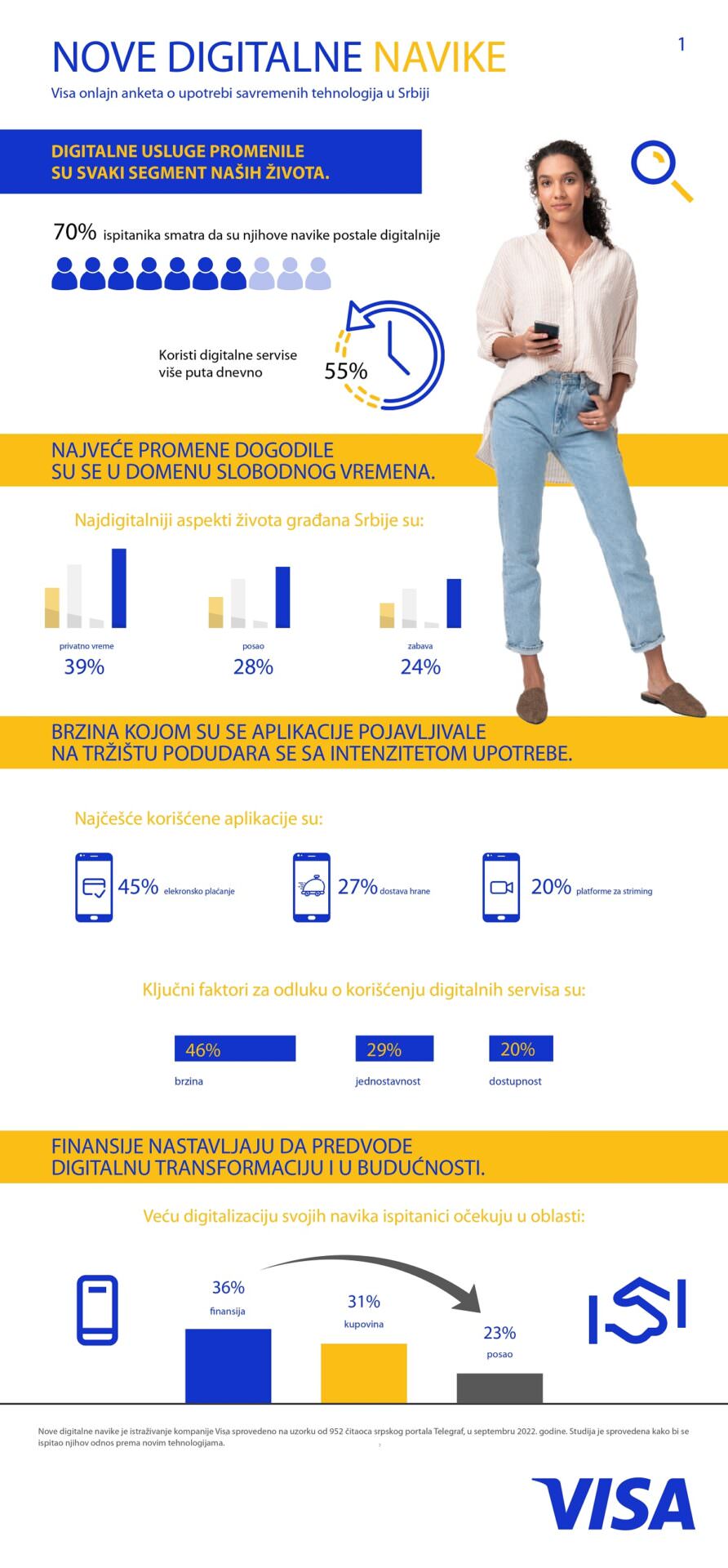 Prema najnovijem istraživanju koje je sprovela Visa „Nove digitalne navike“, četiri od 10 ispitanika smatra da je njihova dnevna rutina postala digitalnija nakon pandemije, dok je za gotovo trećinu uglavnom digitalna (42, odnosno 28 odsto).