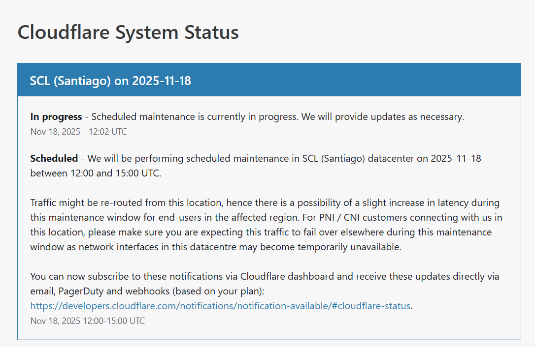 Cloudflare je u isto vreme imao prijavljeno planirano održavanje u jednom od svojih data centara, uz napomenu da može doći do preusmeravanja saobraćaja i kratkotrajnih prekida.