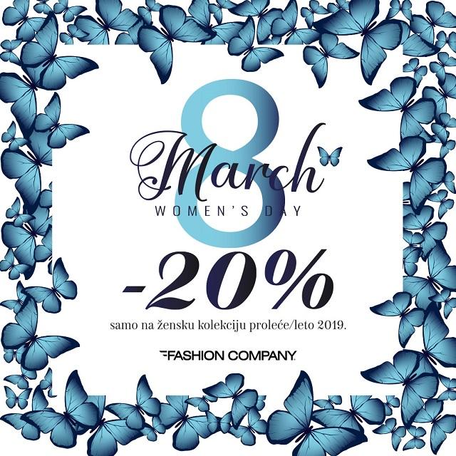 Međunarodni Dan žena idealna je prilika za nezaboravan šoping. Nove ženske kolekcije tek pristigle u FASHION COMPANY prodavnice samo 8. marta snižene su za čak 20%.