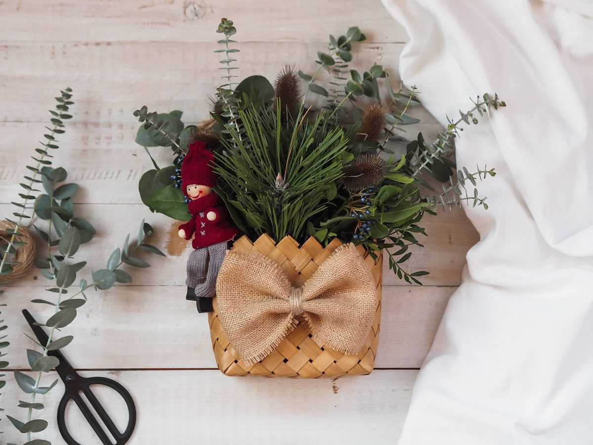 - Zelenilo povezati kanapom ili žicom u buket koji odgovara veličini korpe