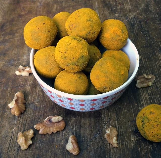 Mešajte rukama tako da ispadne ujednačeno „testo“. Napravite kuglice i svaku od njih uvaljajte u kurkumu. Ne zaboravite da dobro operite ruke da ne ostanu žute od kurkume. Gotove kuglice možete čuvati još par nedelja u zatvorenom kontejneru ili oko mesec dana u zamrzivaču. Prijatno!