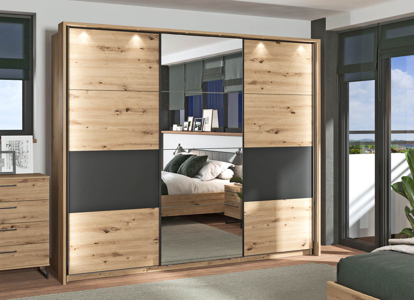 Model kliznog garderobera SARDINIA 270 OG, u kombinaciji dekora artisan hrasta i crnog dekora, sa ogledalom na centalnom frontu, spoj je topline naturalnog i rustičnog sa karakteristikama industrijskog stila u dizajnu enterijera. Upotrebni prostor ovog modela čine police u središnjem delu i dve garderobne šipke u levom i desnom delu. Pripada istoimenoj kolekciji SARDINIA, sa čijim elementima zaokružuje čitavu enterijersku celinu kada je u pitanju opremanje spavaće sobe. Garderober SARDINIA 270 OG poseduje mogućnost ugradnje usporivača kliznog mehanizma, kao i dodatne LED rasvete, koja uvek napravi poseban ambijentalni doživljaj.