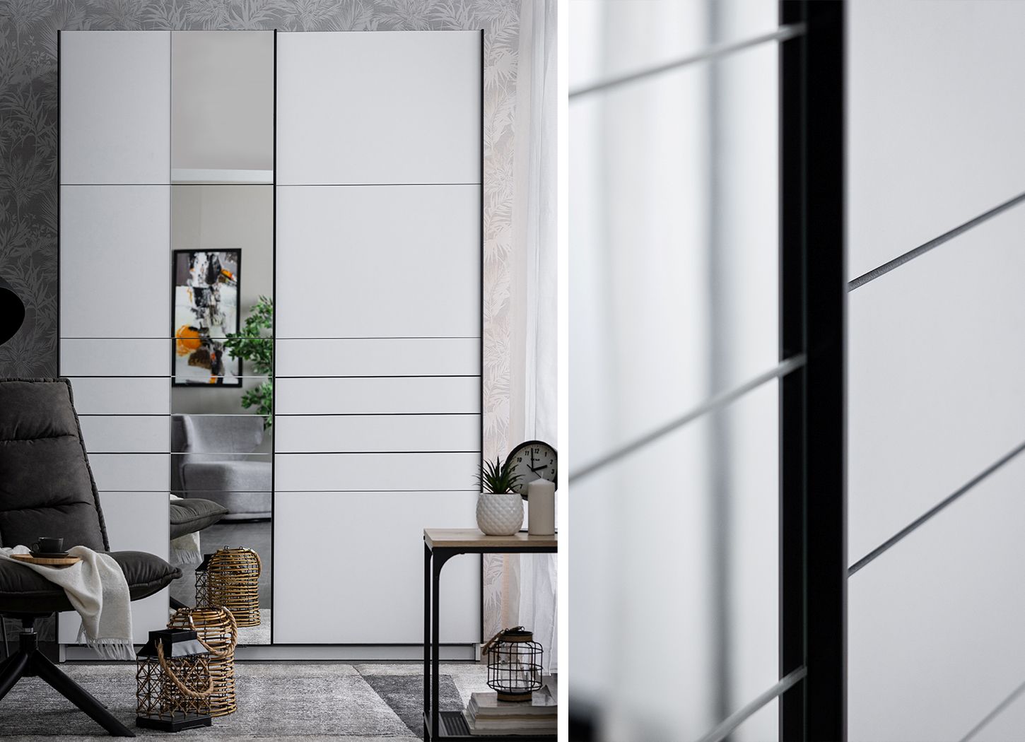 Garderober VEYMONT 150 OG h217 sa kliznim vratima, u opak belom dekoru, kao i sa segmentom sa ogledalom na levom frontu, doprinosi enterijerskoj funkcionalnosti i estetici. Kao deo kolekcije garderobera VEYMONT, upotrebni prostor ovog modela čine graderobne šipke i po jedna praktična polica sa leve i desne strane. Takođe, poseduje mogućnost dodavanja seta polica odgovarajućih za ovaj model garderobera, kao i mogućnost ugradnje usporivača za klizna vrata. Dizajneri enterijera Forma Ideale predlažu da prostor upotpunite foteljom STORM, kao i veštačkim cvećem u saksiji.