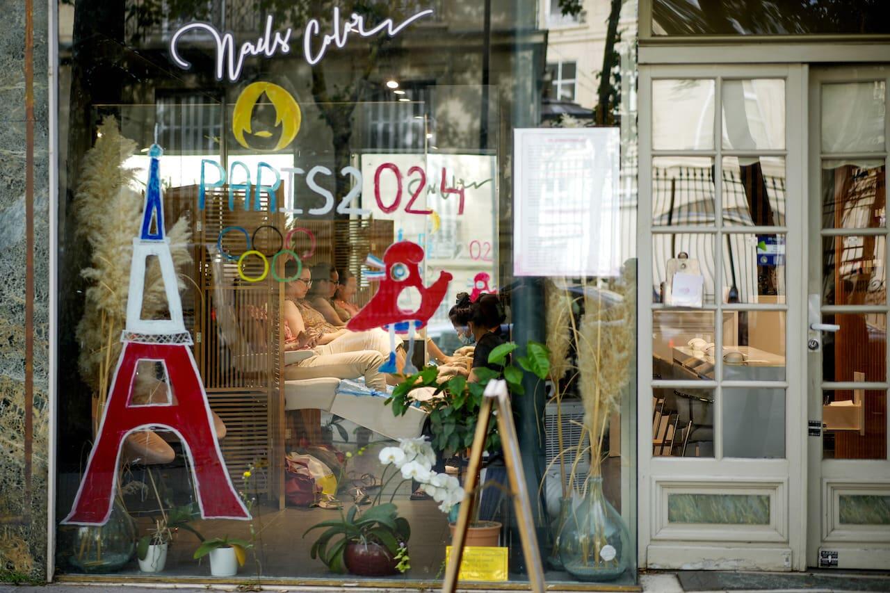 Clients have a pedicure at a nail bar with the Olympics logo on the window, ahead of the 2024 Summer Olympics, Thursday, July 25, 2024, in Paris, France. (AP Photo/Andrew Medichini)