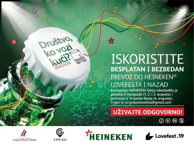 Za posetioce Heineken® Lovefesta, kompanija HEINEKEN Srbija je i ove godine, u okviru tradicionalne akcije „Društvo, ko vozi kući?“, organizovala bezbedan i besplatan autobuski prevoz za odlazak i povratak sa popularnog festivala u Vrnjačkoj Banji.