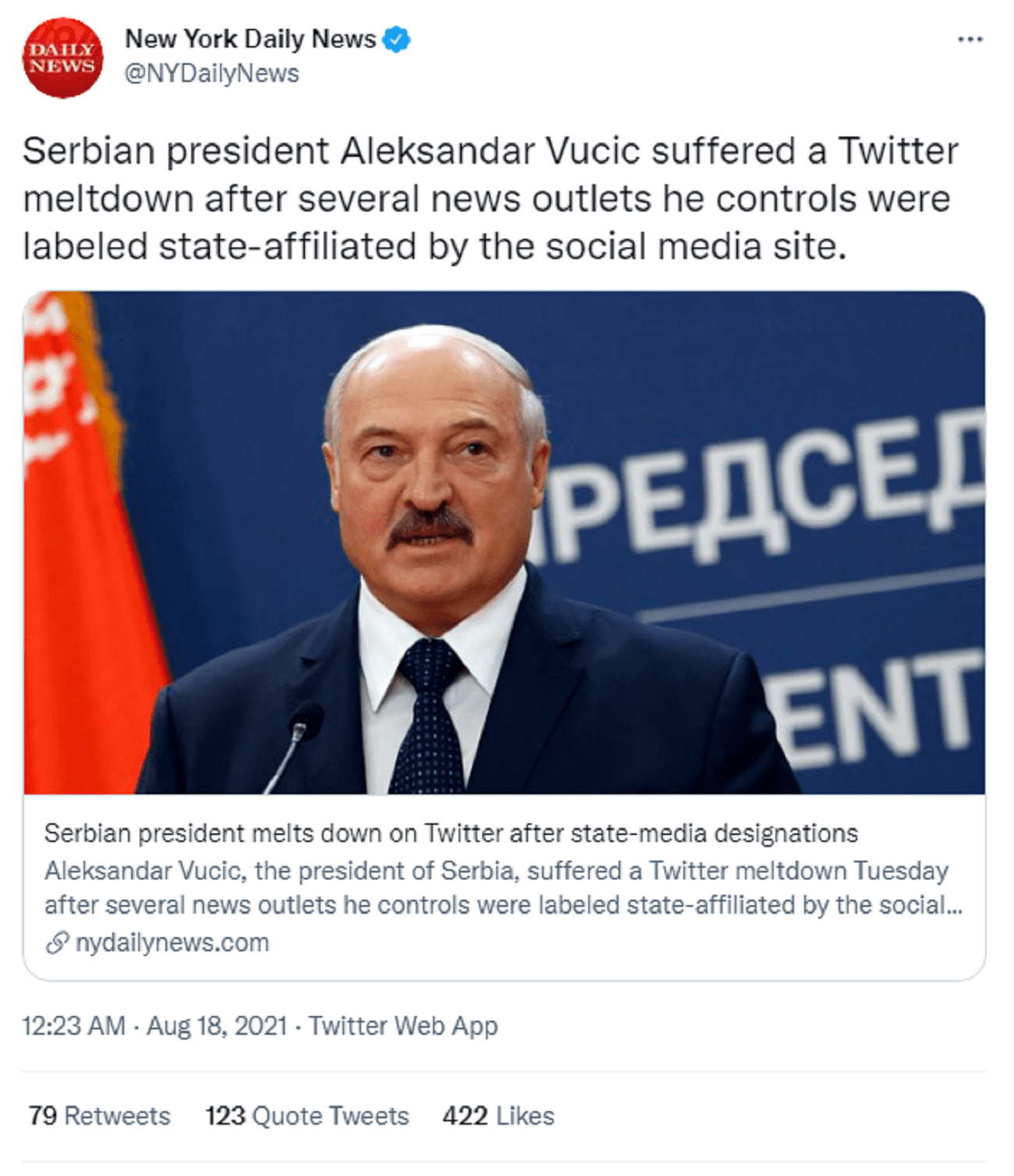 Serbian president Aleksandar Vucic suffered a Twitter meltdown after several news outlets he controls were labeled state-affiliated by the social media site.https://t.co/94myg3bryP