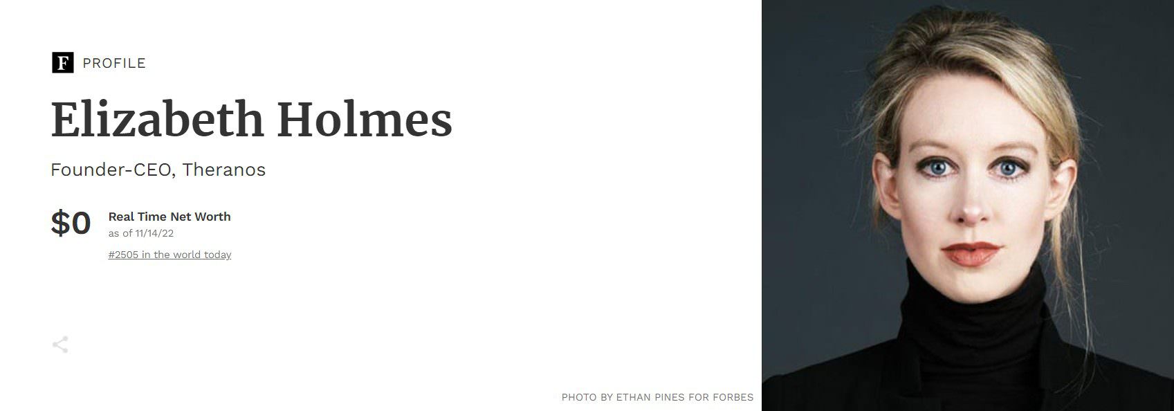 Forbes je revidirao procenu neto vrednosti Holmsove na 0 dolara u junu 2016. usred informacija da se kompanija suočila sa nizom istraga federalnih agencija. Januara 2022. Holms je proglašena krivom po četiri od 11 optužbi za prevaru, oslobođena je po četiri tačke, a porota nije donela presudu po 3 tačke.