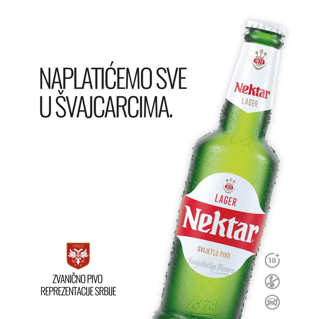 Nektar pivo kao sponzor fudbalske reprezentacije Srbije zajedno sa svima nama je navijalo, uspeli smo da prenesemo šta smo svi mislili, da se zajedno nadamo, radujemo i tugujemo i uz pivo lakše podnesemo što ipak nismo uspeli sve da „naplatimo u Švajcarcima“.