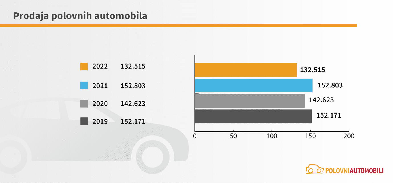 Prema pomenutoj analizi, koju je sproveo sajt Polovni automobili na osnovu podataka prikupljenih u saradnji sa „CUBE Team“-om, prodaja polovnih automobila iz uvoza tokom 2022. godine manja je za 15 odsto u odnosu na prodaju ostvarenu u tokom 2021. godine. Podatak koji je donekle iznenađujuć jeste da je prodaja polovnih automobila iz uvoza u 2022. godini manja za 8 odsto od njihove prodaje u 2020. godini, kada je na snazi bilo vanredno stanje i lokdaun.