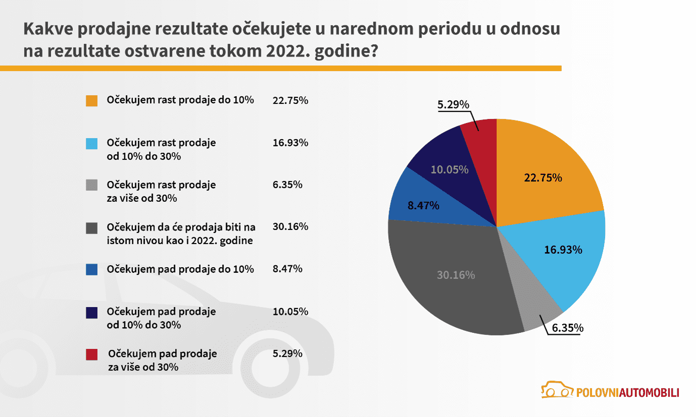 U skladu sa tim su i rezultati nove ankete koju je sproveo sajt Polovni automobili tokom januara ove godine. Oni se veoma razlikuju od njihovih prognoza za 2022. godinu. Naime, čak 46 odsto prodavaca očekuje rast prodaje u narednom periodu. Oko 30 odsto njih ipak veruje da će prodaja biti na istom nivou kao prethodne godine, a 24 odsto navodi da očekuje pad prodaje.