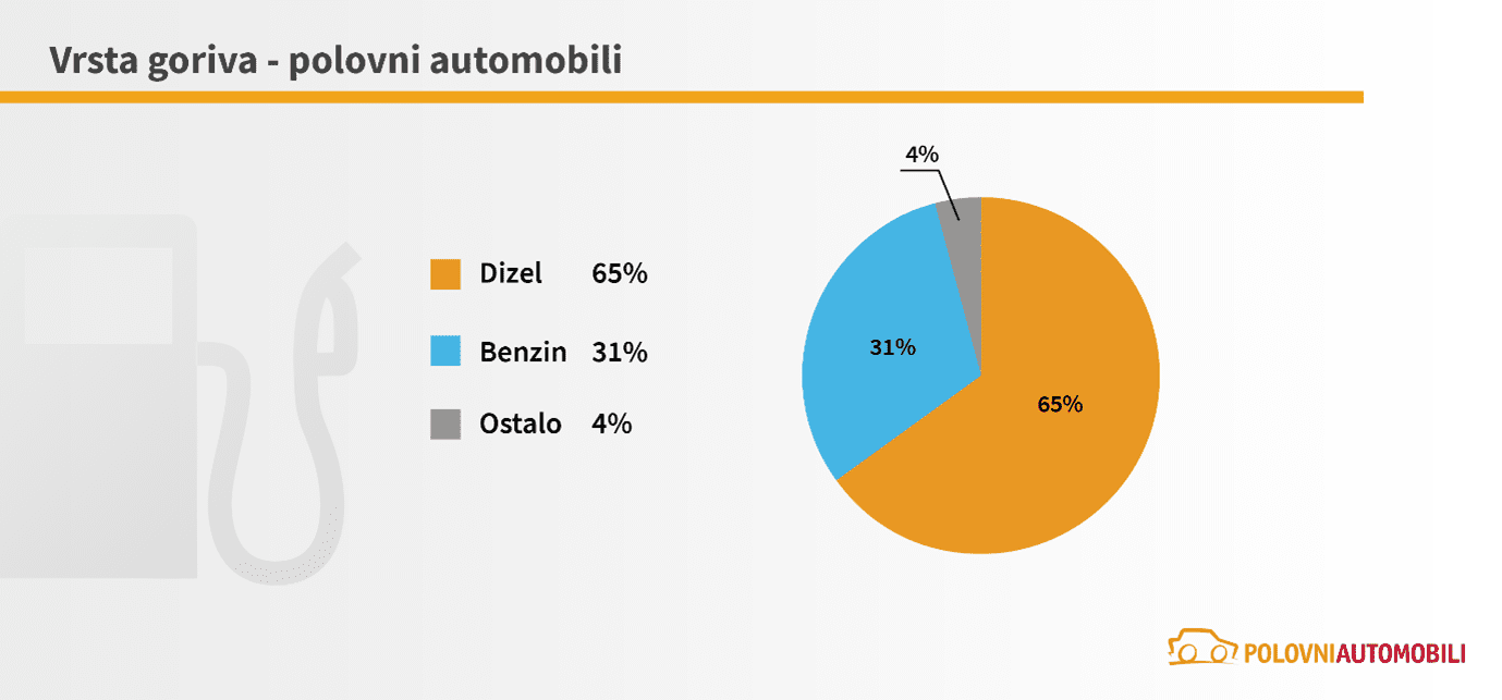 Kao i ranijih godina, u 2022. godini najveći broj kupaca polovnih automobila odlučio se za kupovinu onih sa dizel motorom. Stoga, čak 65 odsto prodatih polovnih automobila činila su vozila sa dizel motorom, a 31 odsto na benzin.