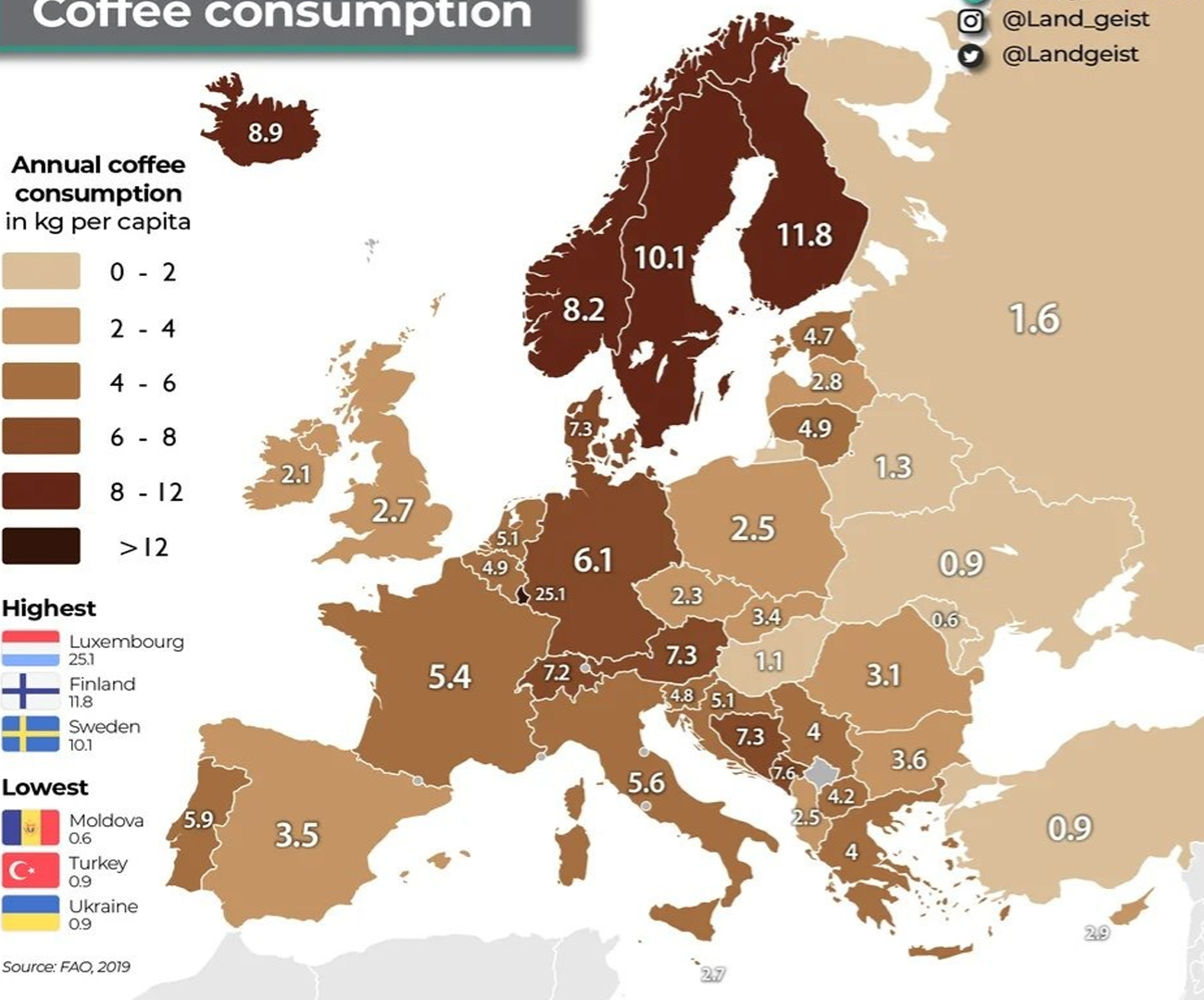 Ona se najviše konzumira u Luksemburgu – 25,1 kilogram godišnje po stanovniku. Land Geist navodi da je ovaj podatak pomalo čudan. Nagađa se da bi ovaj podatak mogao biti uzrokovan ljudima iz susednih država koji kupuju kafu u Luksemburgu zato što je možda jeftinija ili je ovakav zbog male populacije Luksemburga.
