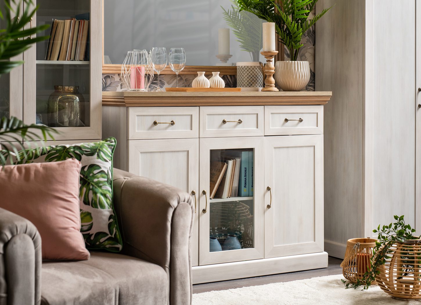 Komode u dnevnom boravku su svakako veoma korisne, a najbolje je da budu kombinacija fioka i polica. Idealno je kada je bar deo sa policama sa zastakljenim vratima, jer predstavlja vrstu izloga za omiljene sitnice i dekoraciju. Komoda ROYAL u beloj boji, oplemenjena klasičnim dekorativnim elementima, pravi je ukras svakog dnevnog boravka. Gornja površina komode može poslužiti za raznu dodatnu dekoraciju, omiljenu biljku, ili praktičnu upotrebu gde će čaše za piće iz bara biti na dohvat ruke, dok boce mogu biti odložene u zatvorene police komode.