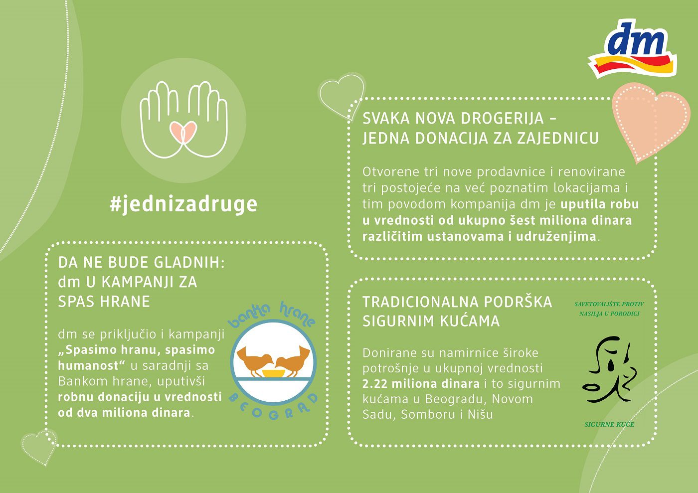 „Kompanija dm uspešno posluje na teritoriji Srbije skoro 18 godina, a mi se konstantno trudimo da zajednici uzvratimo na dugogodišnjem poverenju tako što pokrećemo brojne humanitarne akcije i društveno odgovorne projekte kroz koje doprinosimo konkretnim promenama. Drogerijski lanac će da nastavi sa humanitarnim akcijama vodeći se porukom „Čovek u centru poslovanja“, rekla je Svetlana Jovanović-Mitić, menadžerka marketinga u kompaniji dm drogerie markt Srbija.