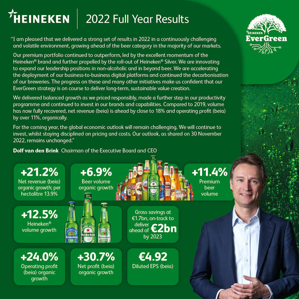 “Drago mi je što smo tokom 2022. godine ostvarili snažne rezultate u okruženju koje je konstantno izazovno i promenljivo, ostvarujući viši rast u odnosu na rast celokupne kategorije piva na većini naših tržišta. Naš premium portfolio je nastavio da premašuje očekivanja, vođen odličnim rastom Heineken® brenda i dodatno osnažen uvođenjem Heineken® Silver brenda. Uvodimo inovacije kako bismo proširili lidersku poziciju u segmentu bezalkoholnog piva i pića izvan kategorije piva. Ubrzavamo primenu digitalnih platformi u našem poslovanju i nastavljamo smanjenje karbonskog otiska u našim pivarama. Napredak u okviru ovih i mnogih drugih inicijativa jasan je pokazatelj da je naša EverGreen strategija na putu da obezbedi dugoročno, održivo stvaranje dodatne vrednosti. Ostvarili smo uravnotežen rast, jer smo odgovorno sprovodili cenovnu politiku, napravili dalji korak u našem planu produktivnosti i nastavili da ulažemo u naše brendove i razvoj naših zaposlenih. U poređenju sa 2019, ostvareni volumeni su se sada u potpunosti oporavili, neto prihod (beia) je bolji za skoro 18%, a organski rast operativnog profita (beia) za preko 11%. U narednoj godini, globalni ekonomski izgledi će ostati izazovni. Nastavićemo da ulažemo, ali ćemo i dalje biti disciplinovani u pogledu cenovne politike i troškova. Naša očekivanja, koja smo prezentovali 30. novembra 2022, ostaju nepromenjena“.