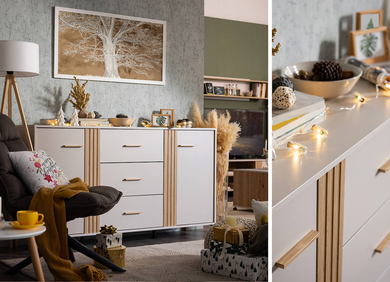 Funkcionalni dodatak za opremanje dnevne i spavaće sobe je komoda BELFORT. Sastoji se od više zatvorenih segmenata za skladištenje – dva zatvorena pregradna dela i tri fioke, dok sama gornja površina komode može biti dodatno mesto za dekoraciju i omiljene časopise.