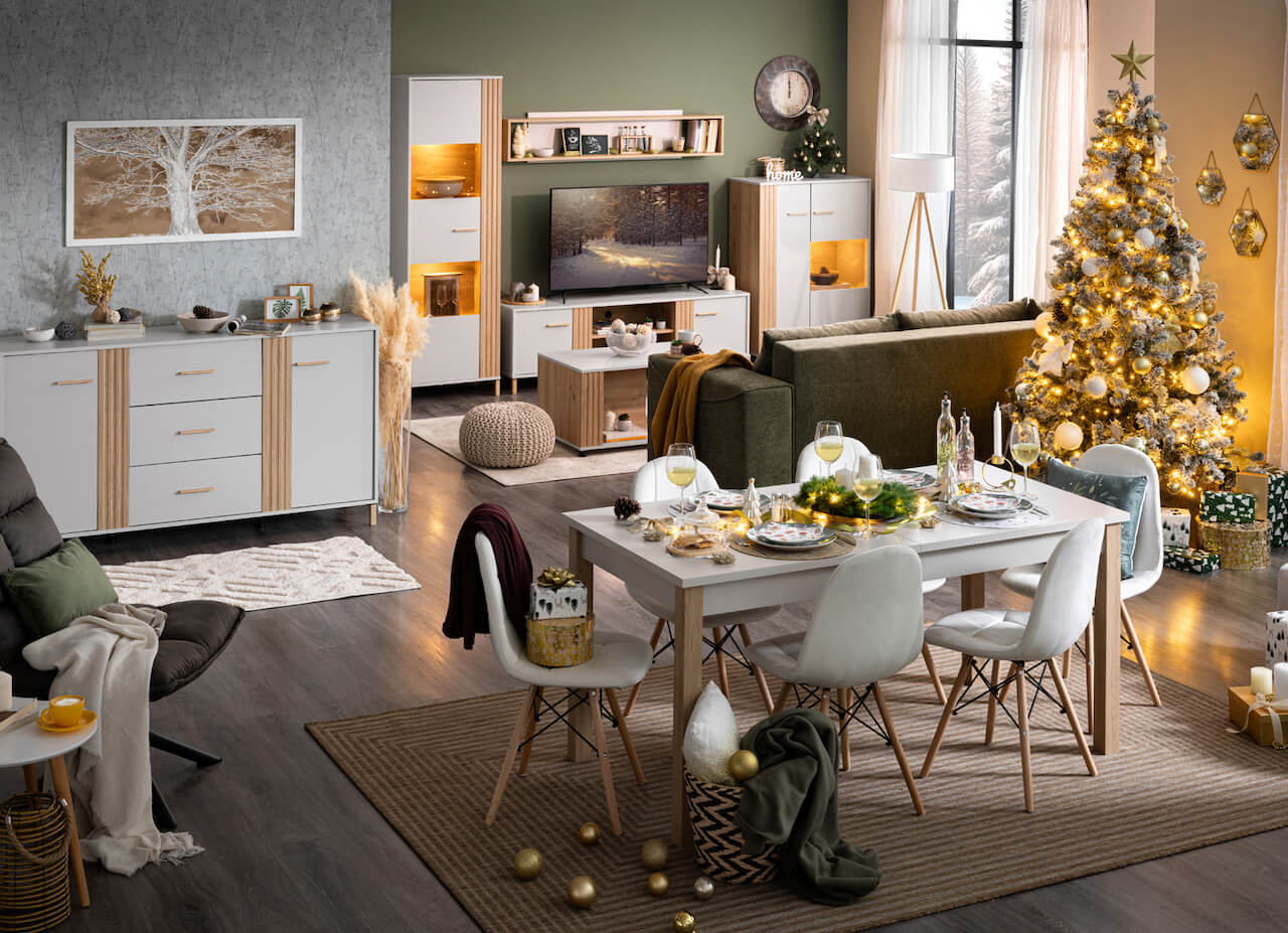 Sistem elemenata BELFORT za opremanje dnevnog boravka predstavlja moderno rešenje za stilizovanje jednog ambijenta, koji možete dodatno urediti u prazničnom duhu. Kombinacija dekora artisan hrasta, kašmira i artisan hrast folije donosi u prostor notu elegancije i ambijentalne topline, a dodatna dekoracija poput podne lampe SANDRA, zavesa, tepiha i dekorativnih jastuka upotpuniće ambijent. Uz ovakav ambijent odlično bi se uklopila i ugaona garnitura LUNA u zelenom dezenu štofa.