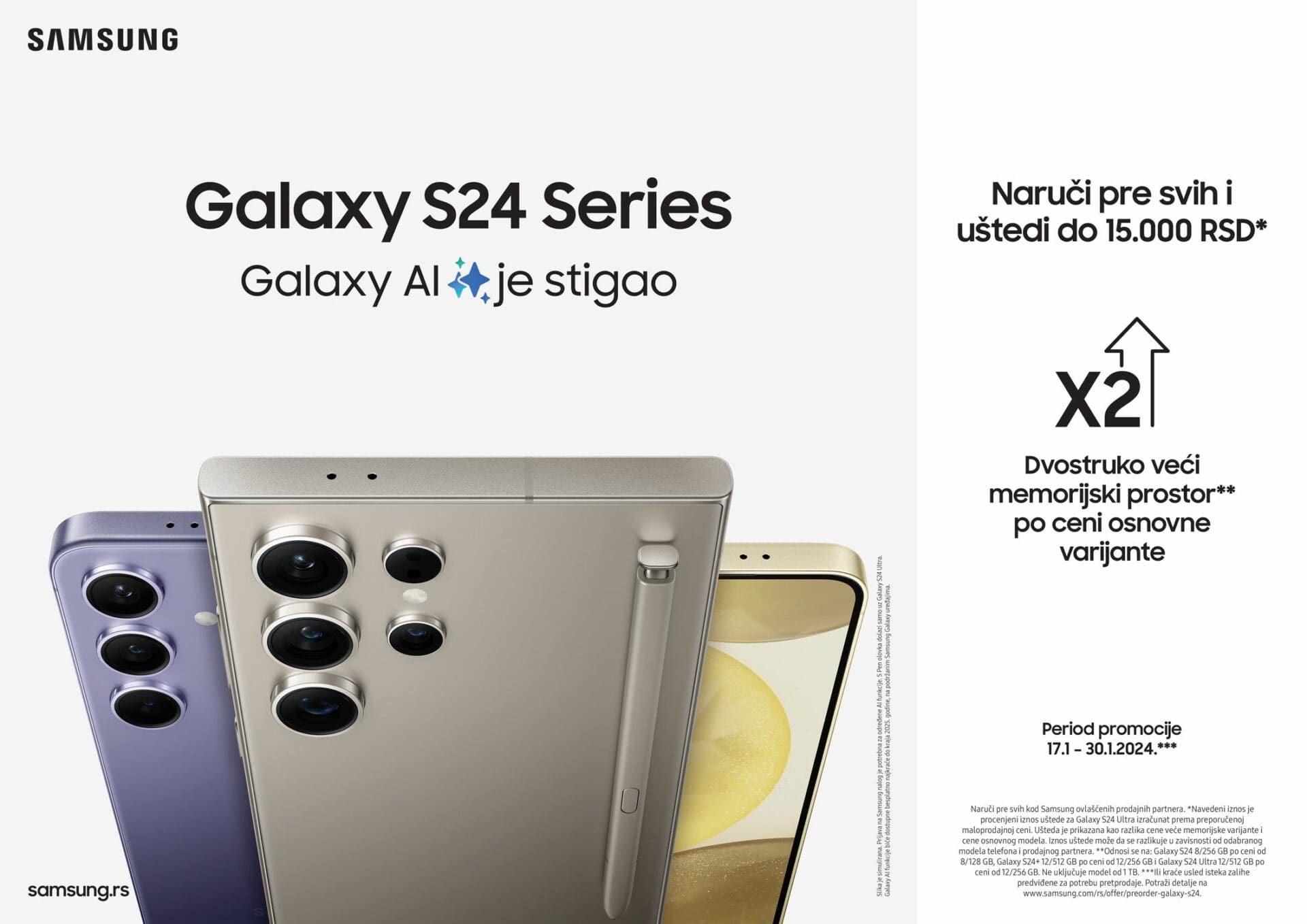 Pametni telefoni iz serije Galaxy S24 dostupni su i u posebnom periodu prednarudžbine, gde kupovinom jednog od uređaja dobijate model sa duplo većim memorijskim prostorom po ceni osnovne varijante , čime se mogu postići značajne uštede. Period prednarudžbine traje od 17. do 30. januara ili do isteka zaliha, a sve informacije možete pronaći na linku.