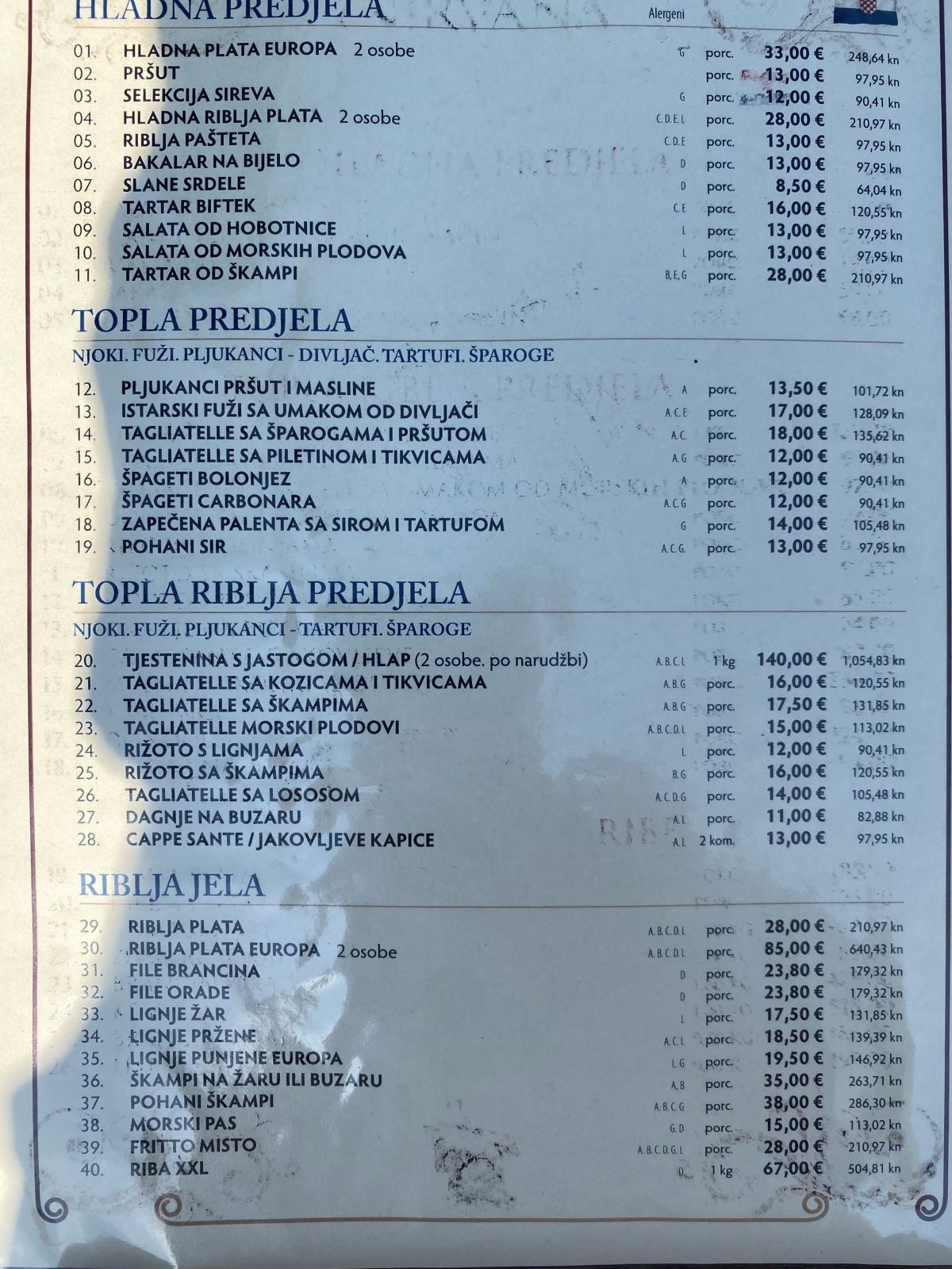 Riblji specijaliteti su odlika ovog kraja pa će vas porcija ribe za dve osobe koštati oko 75 evra, dok se rižoto sa lignjama može pronaći za 15-ak evra.