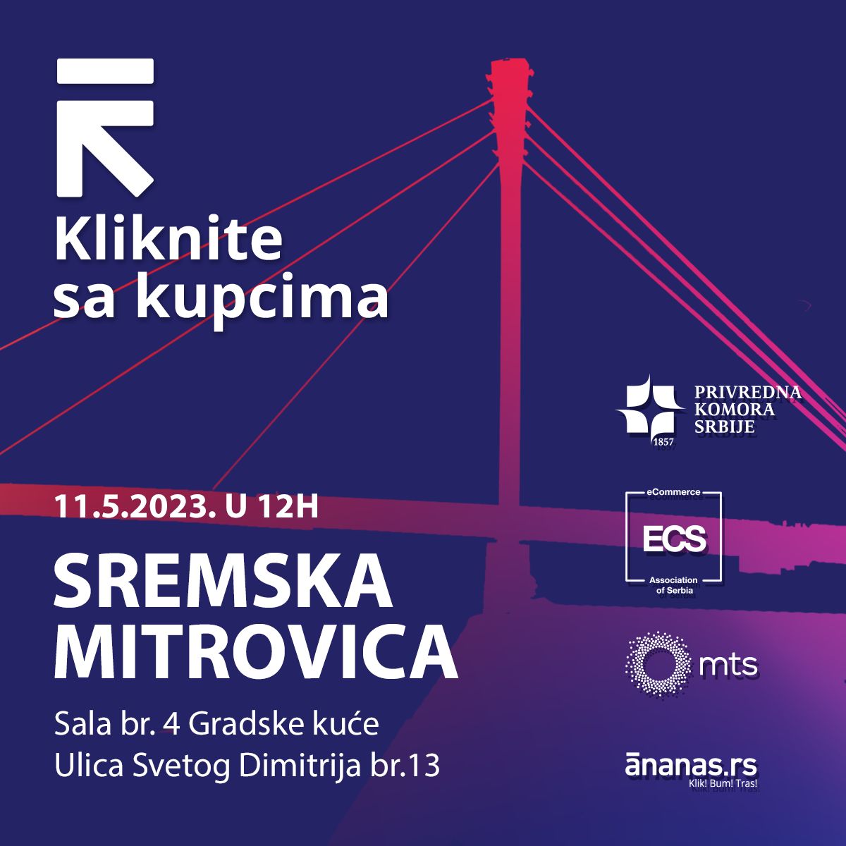 Majski Ananas karavan „Kliknite sa kupcima“ biće održan u Sremskoj Mitrovici, 11. maja 2023. godine, u sali broj 4. Gradske kuće, u ulici Svetog Dimitrija 13, sa početkom od 12h. Ananas karavan „Kliknite sa kupcima“ obuhvata besplatne edukacije na temu online trgovine dostupne svim građanima.