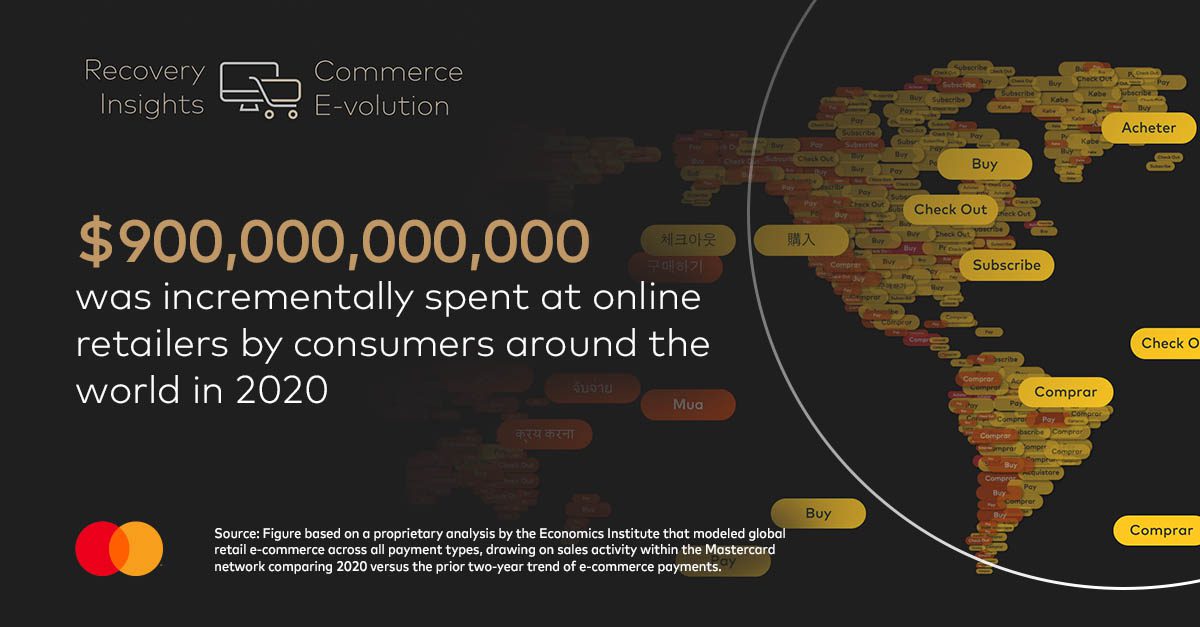 Budući da su zbog pandemije Kovida 19 potrošači širom sveta pretežno ostali kod kuće, gotovo sve, od namirnica do baštenskih potrepština, kupovalo se onlajn, a prema najnovijem izveštaju Mastercard Recovery Insights, to je rezultiralo u dodatnih 900 milijardi dolara potrošenih na onlajn trgovinu širom sveta tokom 2020. godine.