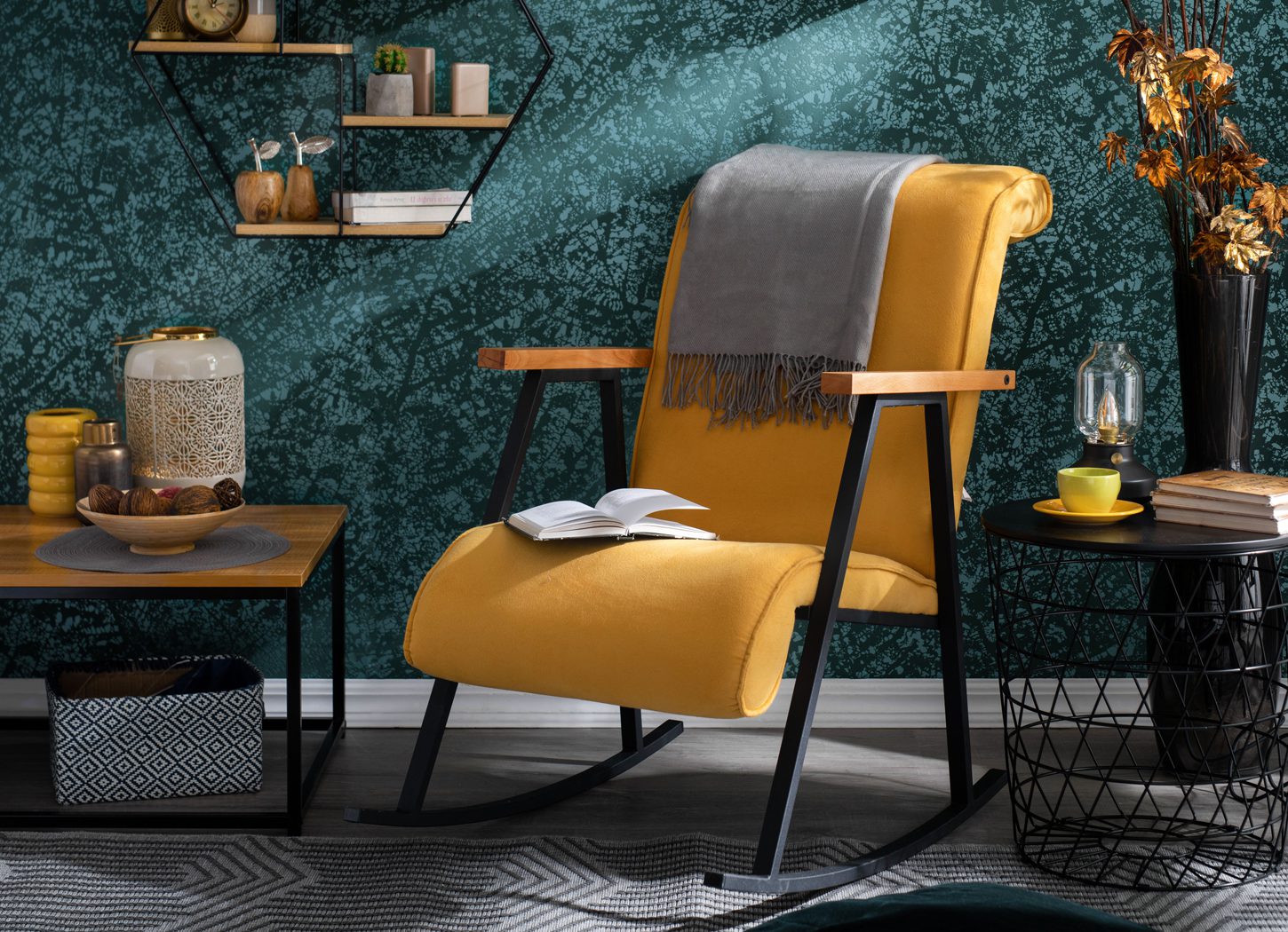 Metal i drvo dekor mogu pružiti i topao i moderan izgled, posebno kada se izaberu slične završne obrade. Stolica na ljuljanje YOKA upravo je takva kombinacija metala i drvo dekora, a štof u žutoj boji unosi dodatnu toplinu u ambijent dnevnog boravka. Dodatni elementi u prostoru mogu biti i zidne police VKS-80052 i VKS-80026 od metalnih kontrukcija, koje će estetski doprineti izgledu ambijenta, ali istovremeno i poslužiti za odlaganje dekoracije i sitnica.