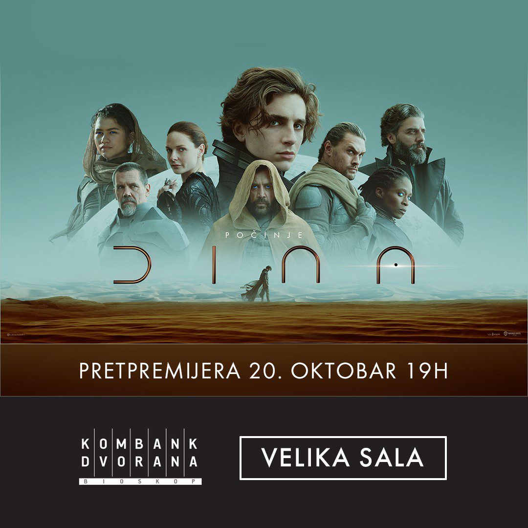 Najnovija SF adaptacija američko-kanadske koprodukcije, romana Franka Herberta DINA biće prikazana pretpremijerno u sredu 20.oktobra u 19h u Velikoj sali , nakon čega će se naći na redovnom repertoaru bioskopa Kombank Dvorana.