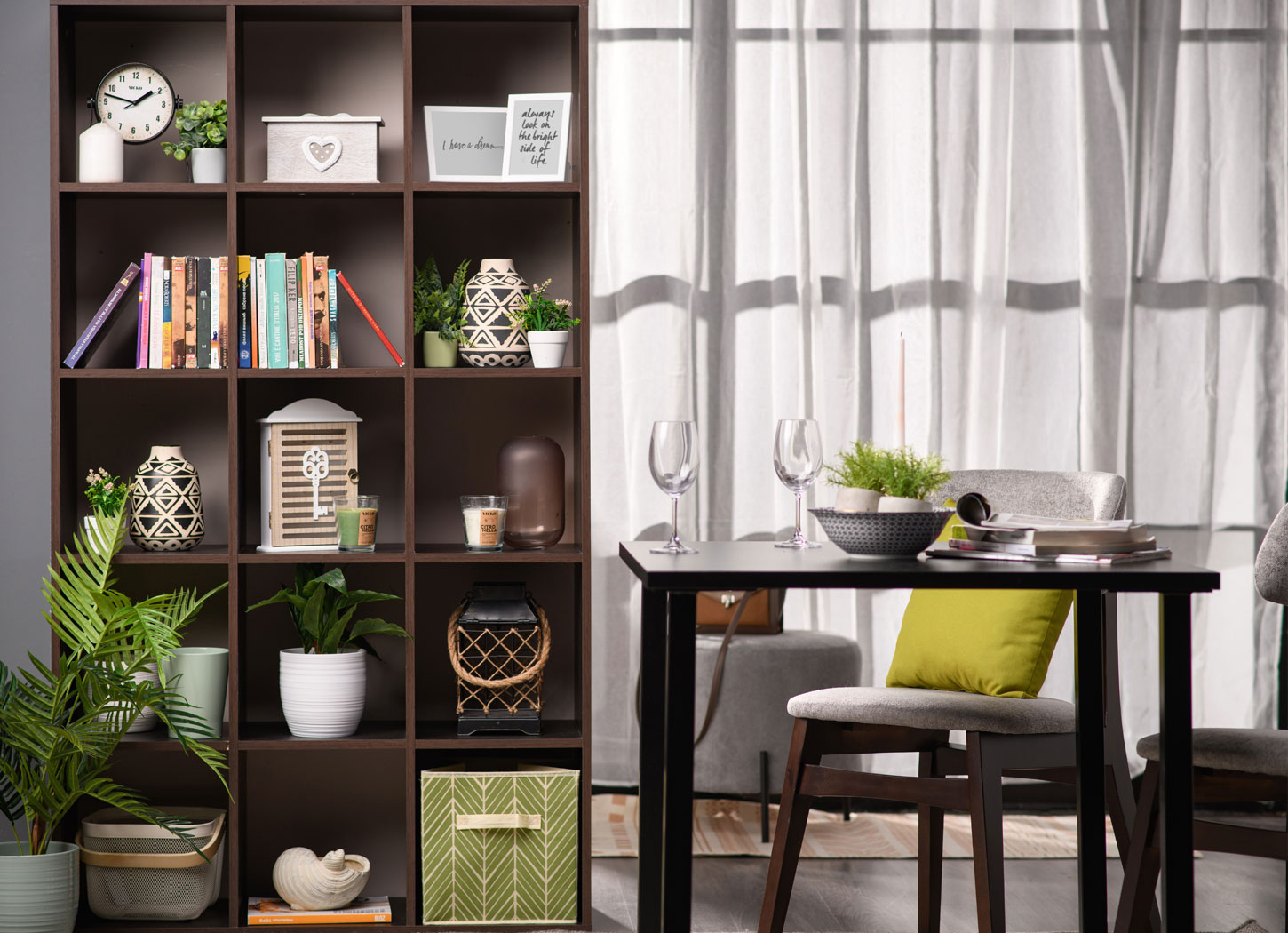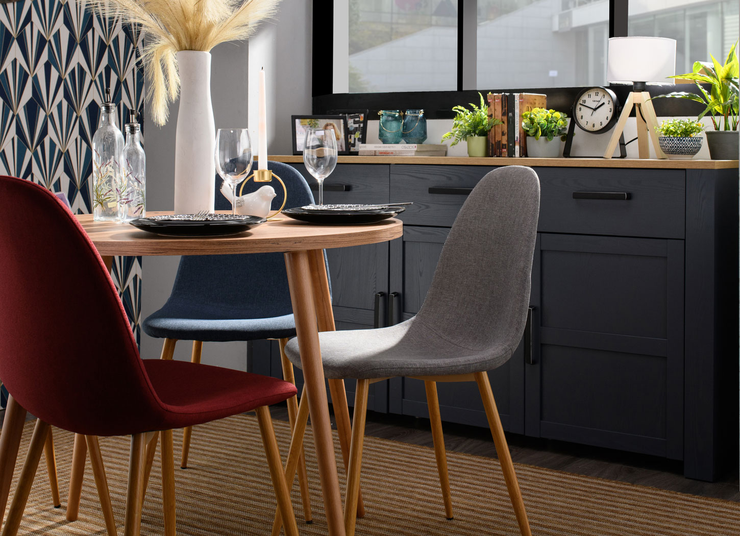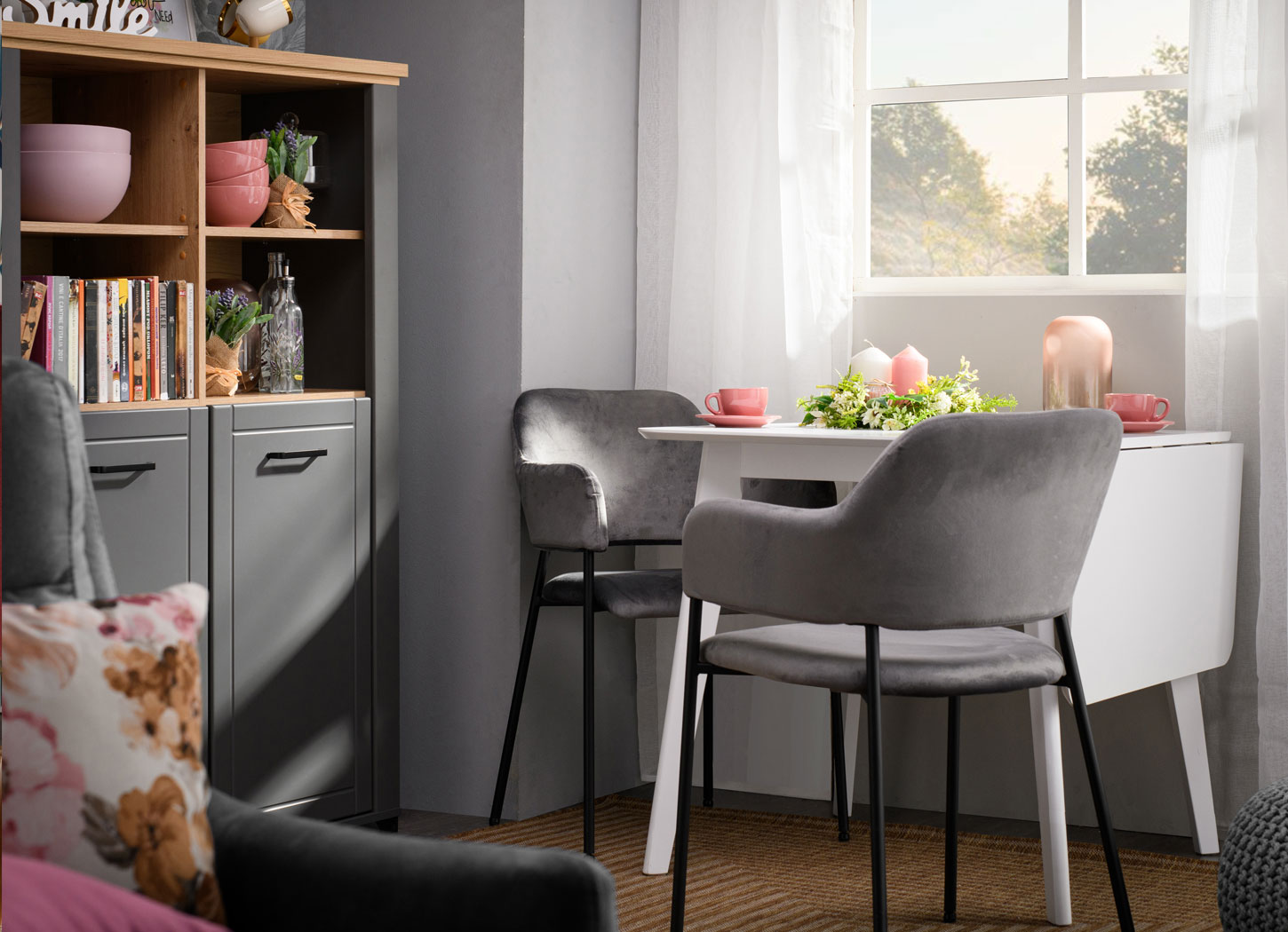 Ambijent možete upotpuniti komadima sličnih nijansi i dezena. Izbor autentične trpezarijske stolice savremenog dizajna, kao i vitrine VALENCIA, izrađene u dekoru grafit sive sa crnim metalnim ručicama, predstavlja odličan odabir za ambijent trpezarije. Kao dodatnu dekoraciju uvek možete dodati privlačnu vazu za cveće koja će osvežiti prostor.