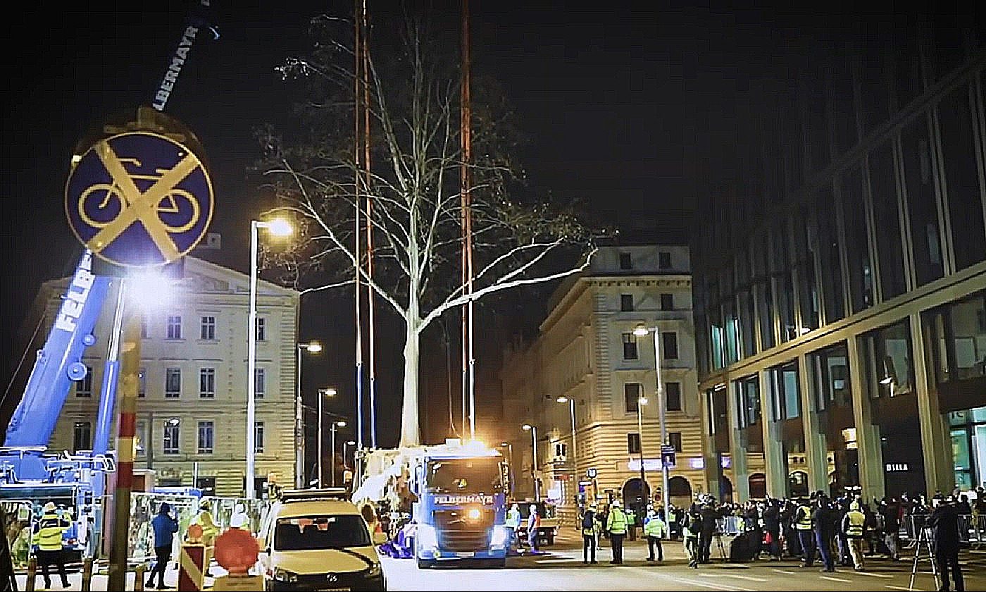 Kako navode tamošnji mediji, drvo je iskopano bez obzira na jake snežne padavine, dizalicom je postavljeno na kamion a zatim odvezeno na novo odredište.