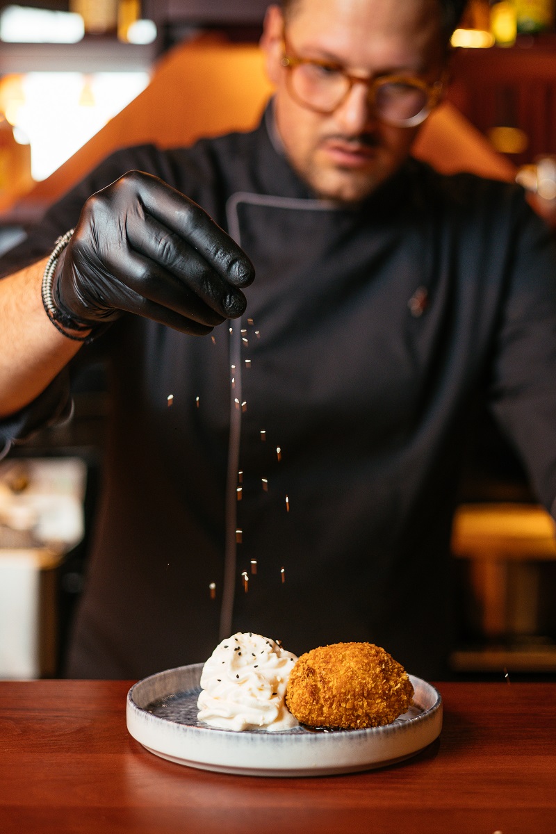Knedla punjena brisketom i dimljenim sirom i slag od parmezana