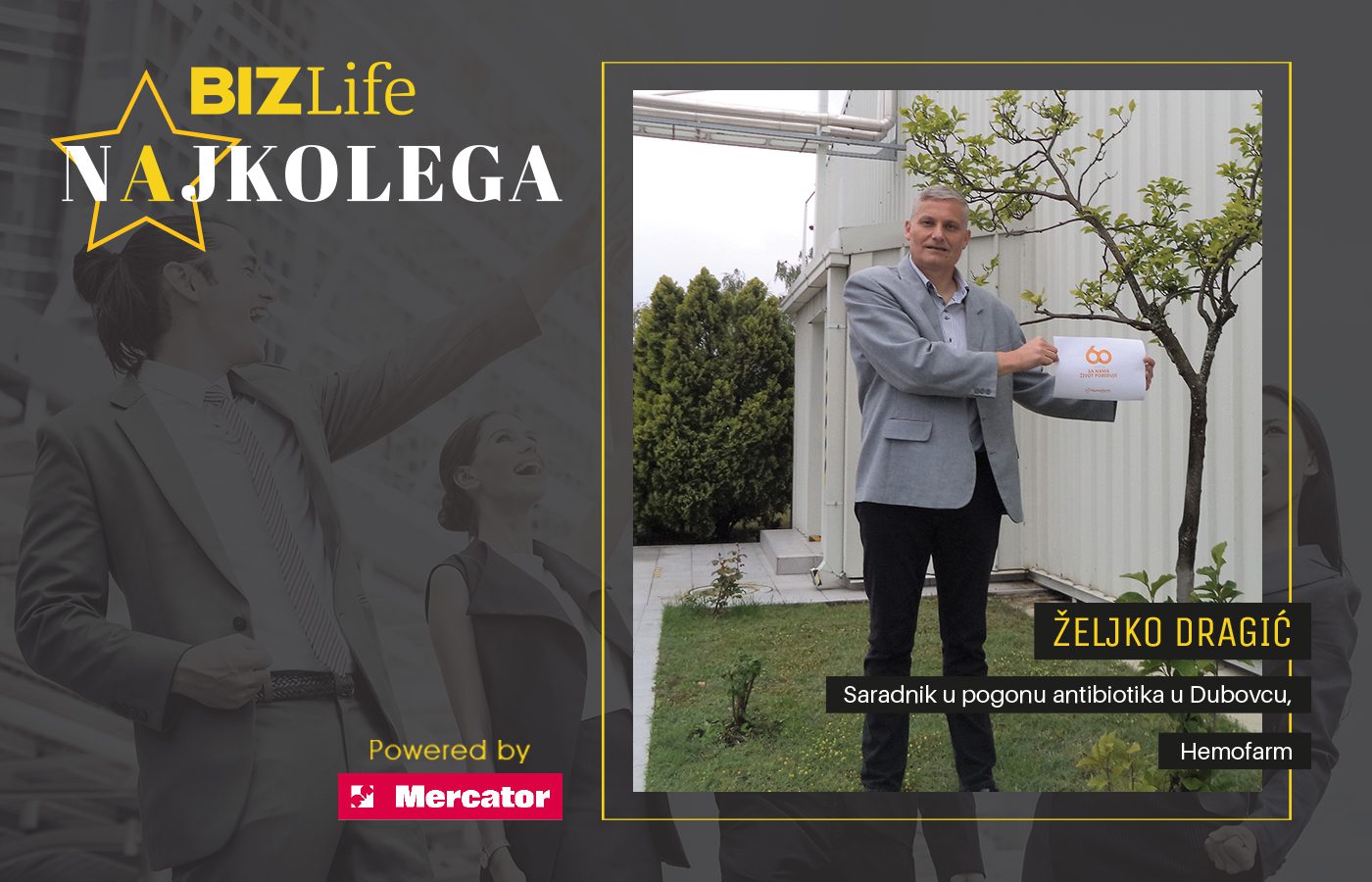 Jednoglasno i uz nominaciju najbližih saradnika, titula NAJKOLEGE u okviru kompanije Hemofarm pripala je Željku Dragiću, saradniku u pogonu antibiotika u Dubovcu.