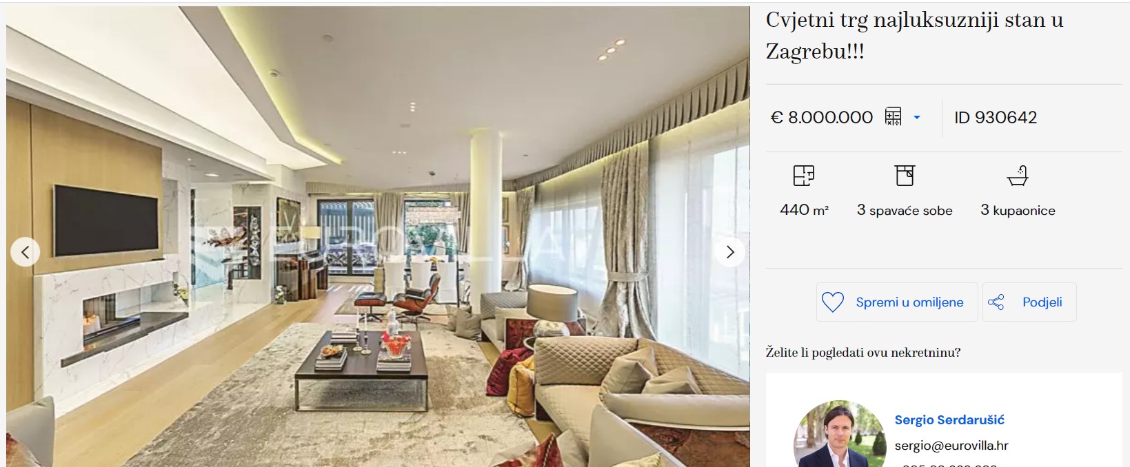 Tako se na web stranici jedne zagrebačke agencije za nekretnine oglašava stan u Zagrebu za iznos od, ni manje ni više, osam miliona evra.
