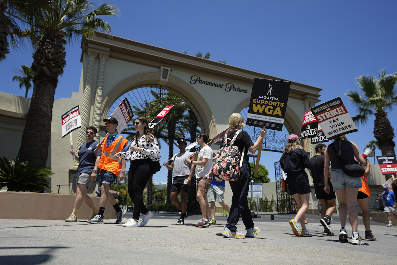 Picketers gather outside Paramount Pictures during a Writers Guild rally on Thursday, July 13, 2023, in Los Angeles (AP Photo/Mark J. Terrill)