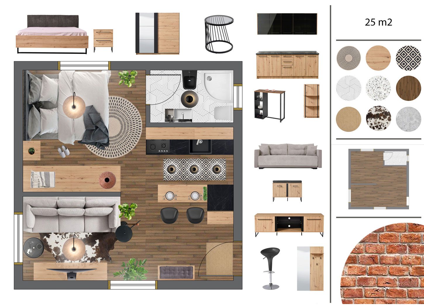 Ambijentu će industrijski izgled dati i neobrađeni materijali, poput opeke i betona, a multifunkcionalni komadi nameštaja odgovaraju standardima koji zadovoljavaju potrebe svakodnevnog života. Maksimalni komfor u vašem malom prostoru pružiće vam praktični mehanizmi, kao i dodatni prostori za odlaganje i kreativnost.
