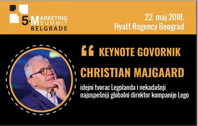 Prvi put u Srbiji, Christian Majgaard, idejni tvorac Legolenda i nekadašnji najuspešniji globalni direktor kompanije Lego, kao keynote govornik zatvoriće ovogodišnju konferenciju govoreći o svojoj dugoj i izuzetno uspešnoj karijeri u oblasti marketinga i menadžmenta. Otkriće kako je Lego uspeo, pao i ponovo uspeo, zašto je danas važno biti uspešan u marketingu i koja je očekivana kompetentnost direktora marketinga.
