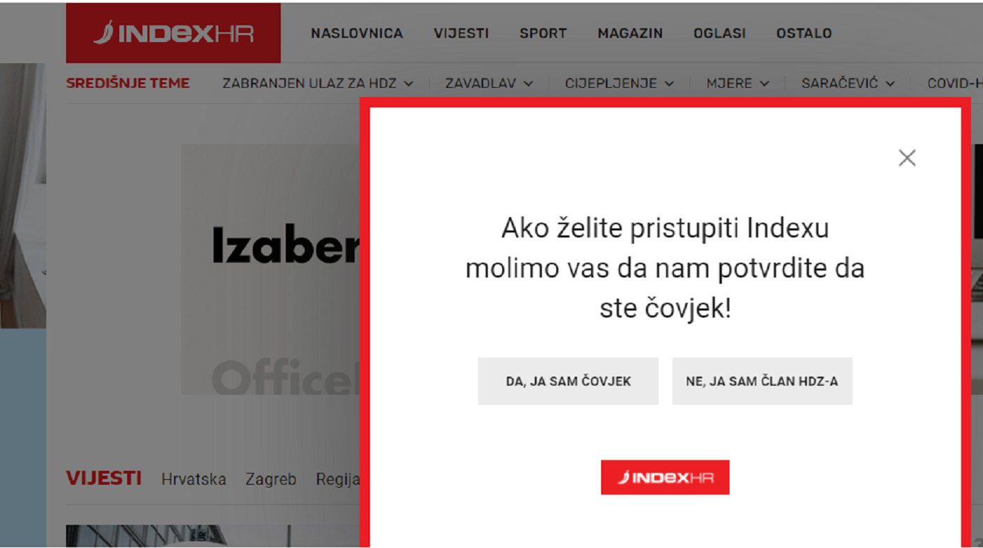 Neobičan pop-up na Indexu: Da li ste čovek ili član HDZ-a?