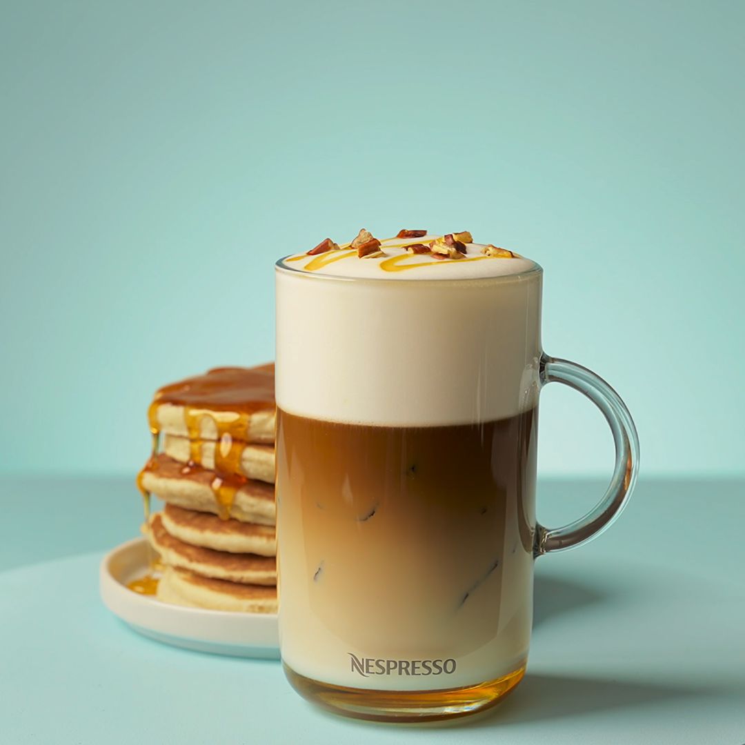 Sipajte 80 ml Maple Pecan kafe pomoću aparata sa Coffee Creations režimom. Zatim u visoku čašu stavite led, dodajte 10 ml javorovog sirupa i 120 ml Barista Oat Milk. Preostalih 100 ml Barista Oat Milk umutite u Aeroccino uređaju pomoću režima za hladnu penu. Sipajte penu preko leda i mleka, a zatim pažljivo dodajte kafu. Na kraju, po vrhu pospite seckane pekan orahe i po želji dodajte još malo javorovog sirupa. Rezultat je osvežavajući napitak sa blagim sladunjavim tonovima i orašastim završetkom – savršen za jesenja popodneva i male rituale uživanja u šolji kafe.