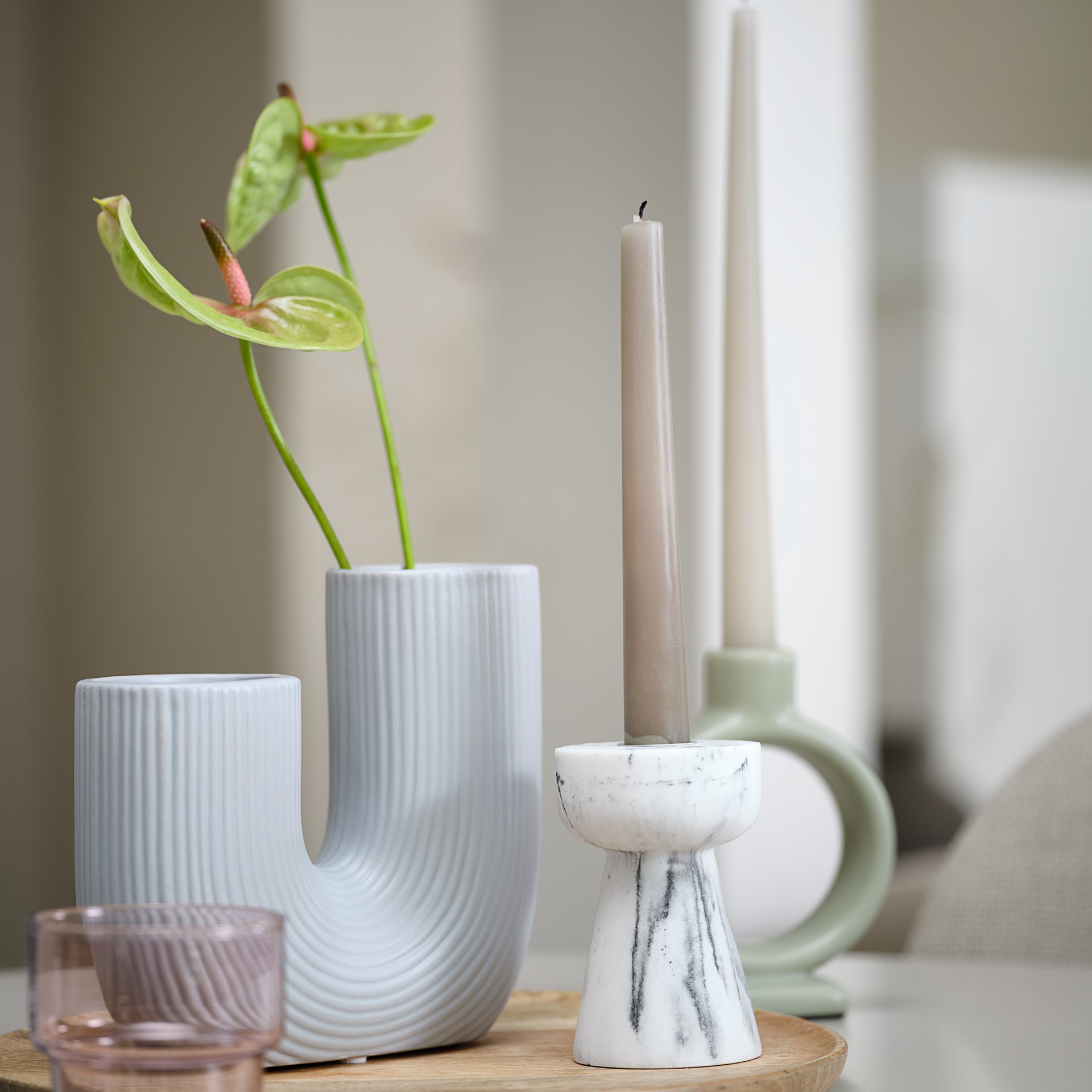 Dizajnerski proizvodi nastali su kao rezultat igre nepravilnih oblika i mekih linija, poput vaze TORMUND koja je estetična kao samostalni ukras, ali takođe i divna u kombinaciji sa cvećem. Pruge na svećnjaku MARK dodaju dodir razigranosti i stvaraju prelep kontrast kada se kombinuju sa plavom bojom sveće BALDUR.