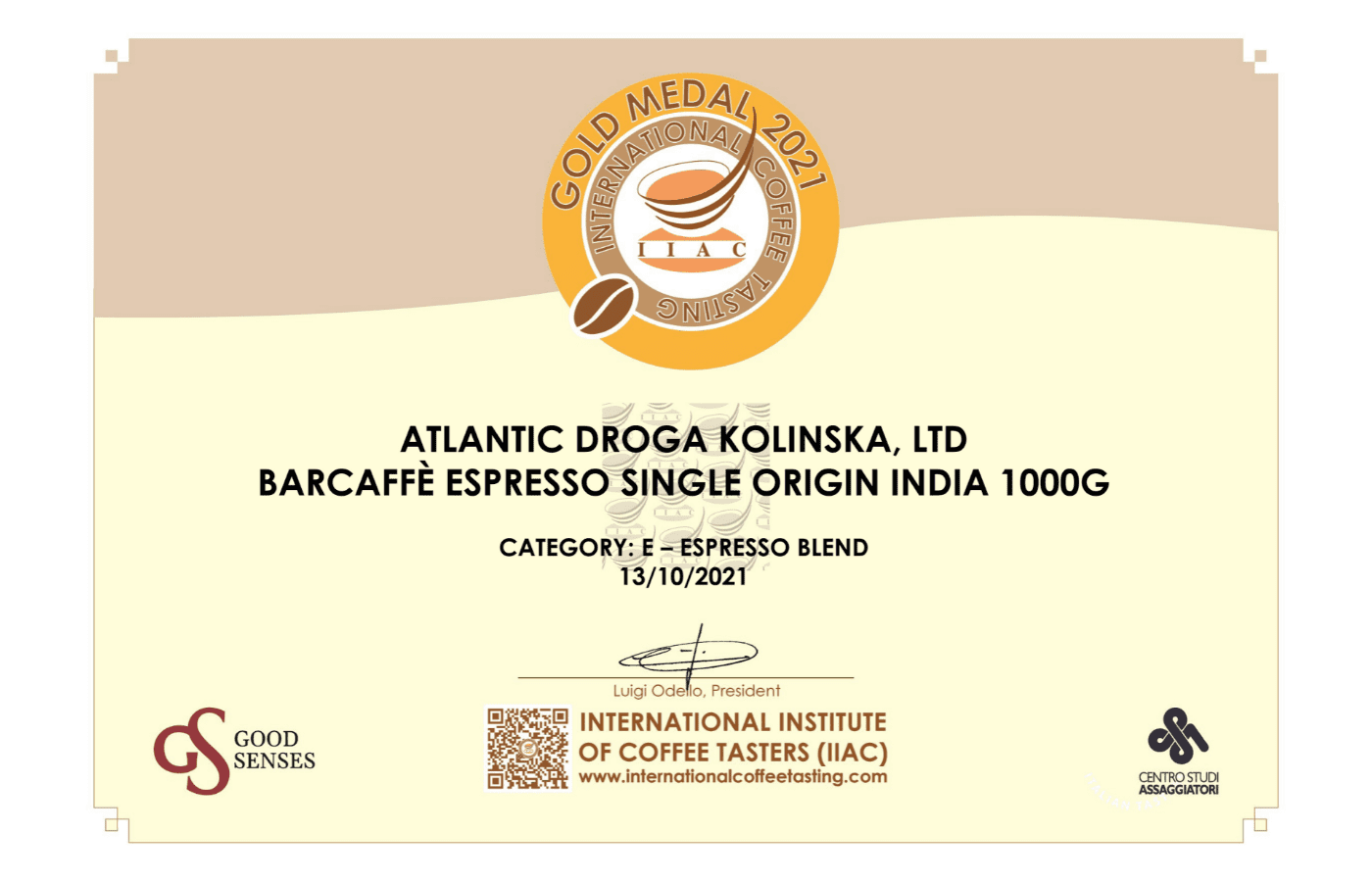 Priznanje za Barcaffe India Single Origin trinaesta je nagrada Međunarodnog instituta degustatora kafe za ovaj brend Atlantik grupe