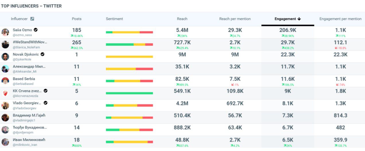 Analitika objava na društvenim mrežama izdvojila je profile koji su imali najviše uticaja na širenje vesti o Novaku. Na prvom mestu je Saša Ozmo, novinar sport kluba i autor knjige „Sportsko novinarstvo“, dok je na drugom mestu fan grupa Novaka Đokovića pod nazivom @Slavica_NoleFam.