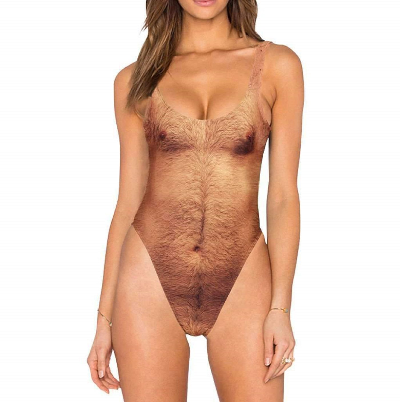 Kupaći kostim je napravljen tako da izgleda kao dlakava muška prsa s prednje strane, dok nazad izgleda kao dlakava leđa.