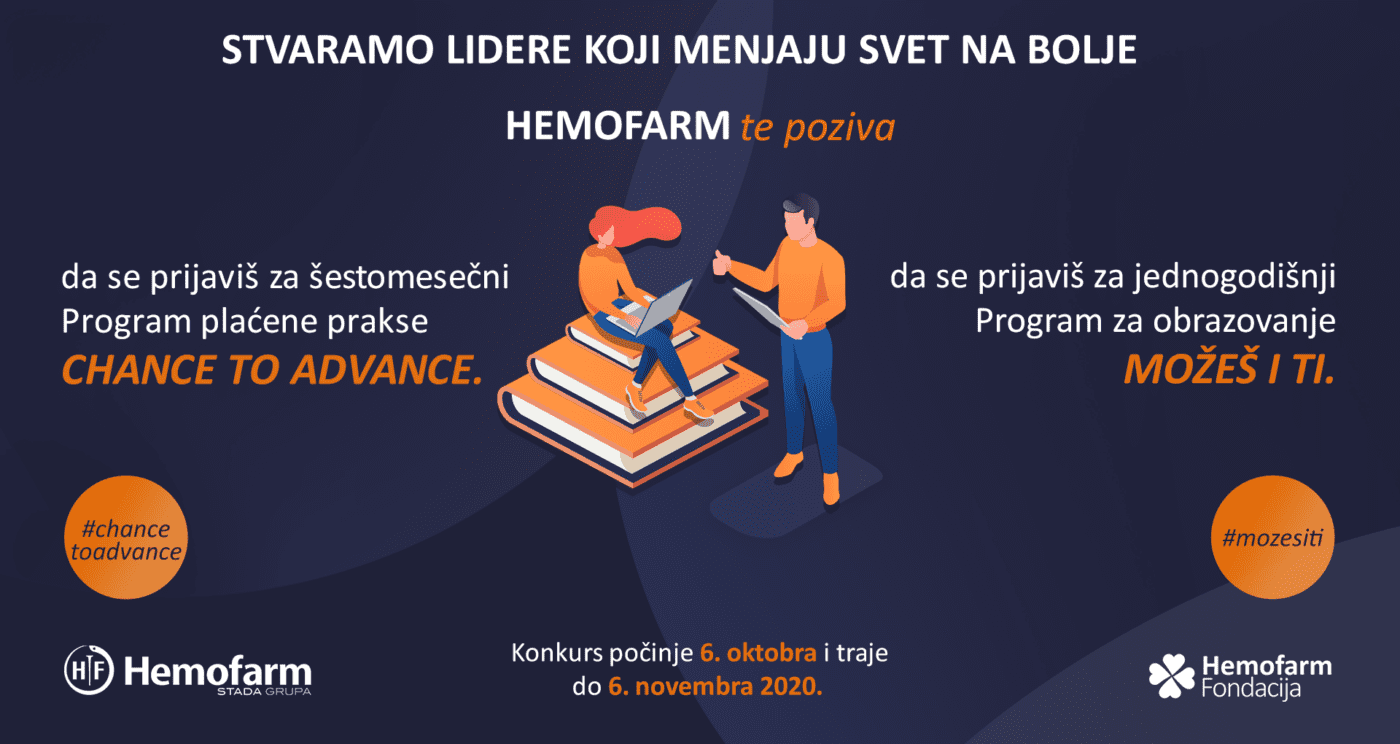 Tradicionalno, i ove jeseni, kompanija Hemofarm poziva najbolje studente završnih godina osnovnih i master studija kao i diplomce stručnih fakulteta u Srbiji da se prijave na jedan od dva aktuelna konkursa: jednogodišnji Program za obrazovanje Hemofarm fondacije “MOŽEŠ I TI“ ili šestomesečni program plaćene prakse “CHANCE TO ADVANCE” u ovoj kompaniji.