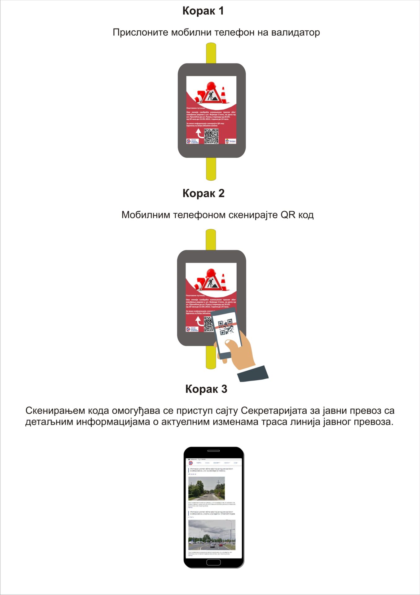 Kako je navedeno na sajtu beograd.rs, za brz i jednostavan pristup informacijama o svim aktuelnim izmenama trasa linija JLPP-a na validatorima će biti dostupan i QR kod čijim skeniranje putem mobilnog telefona korisnici pristupaju sajtu Sekretarijata za javni prevoz – a dato je i uputstvo za upotrebu i skeniranje QR koda.