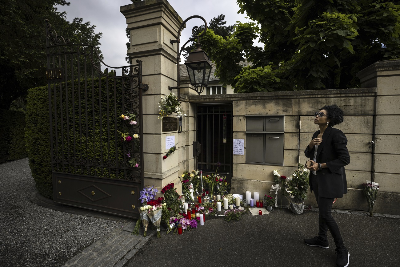 Jerika Seiler looks up at the gate of the villa of singer and stage performer Tina Turner in Kuesnacht, Switzerland, Thursday May 25, 2023. Turner, the unstoppable singer and stage performer died Wednesday May 24, 2023, after a long illness at her home in Kuesnacht near Zurich, Switzerland, according to her manager. She was 83. (Michael Buholzer/Keystone via AP)