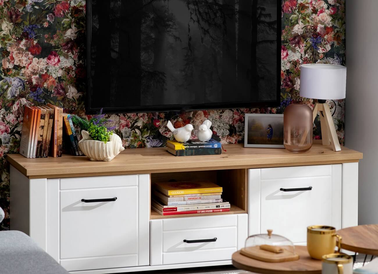 Uz specifične boje zidova ili šarene tapete, najbolje je da se opredelite za neutralne TV police, poput bele ili kombinacije bele i drvo dekora. Sjajan primer je TV polica VALENCIA TV 160 3K1F u kombinaciji dekora artisan hrasta i bele mat folije, koja je dizajnerski privlačno rešenje za uređenje dnevnog boravka i daje toplu estetiku enterijeru. Prostor za odlaganje su praktična fioka u središnjem delu, jedan otvoreni i dva zatvorena dela, koji poseduju praktično raspoređene police. Frontovi su obogaćeni crnim ručicama jednostavnog dizajna, koje su usklađene sa dizajnerskom linijom cele kolekcije VALENCIA.
