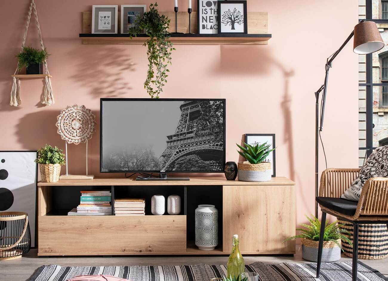 TV polica CORDOBA, u kombinaciji artisan hrasta i crnog dekora, koja se sastoji od otvorenog i zatvorenog segmenta sa pregradnim delom, idealno bi se uklopila kako u nešto tvrđi industrijski ambijent, tako i uz nežno roze – boho ambijent dnevnog boravka.