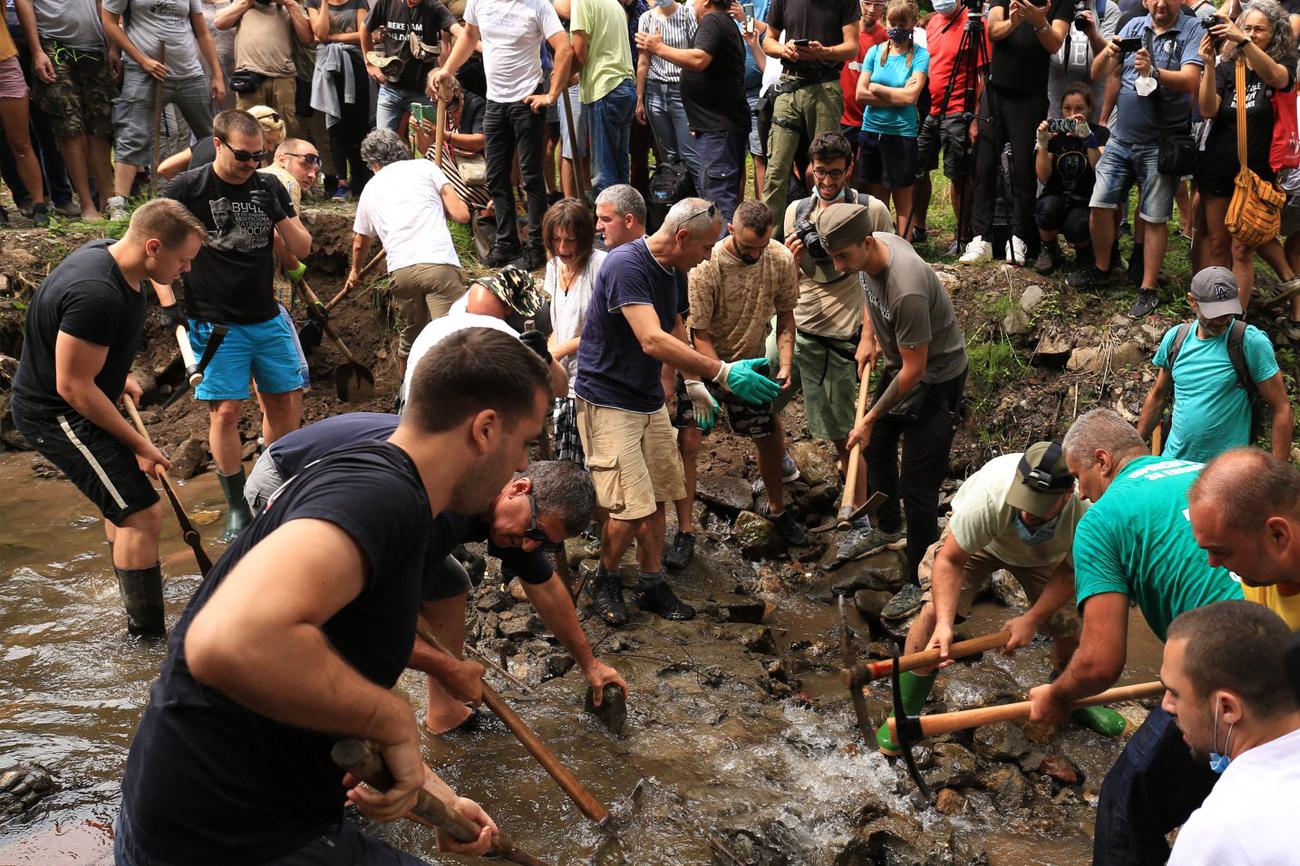 Kada se par stotina građana okupilo kod Zadružnog doma, jedan od vođa inicijative „Odbranimo reke Stare planine“ Aleksandar Jovanović Ćuta preko megafona se obratio građanima i pozvao ih da uzmu alat i siđu do reke.